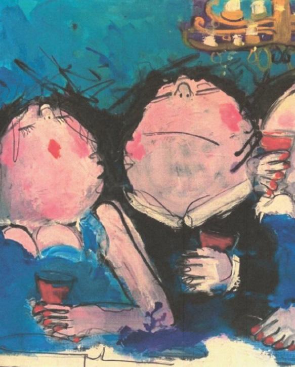 Gerdine’s work is a synthesis between the figurative and the abstract. Her free and painterly style works well with the often inebriated characters she depicts. These gluttonous socialites are shown mid-party; slurping oysters and huge piles of strawberries or demanding excessive quantities of champagne.