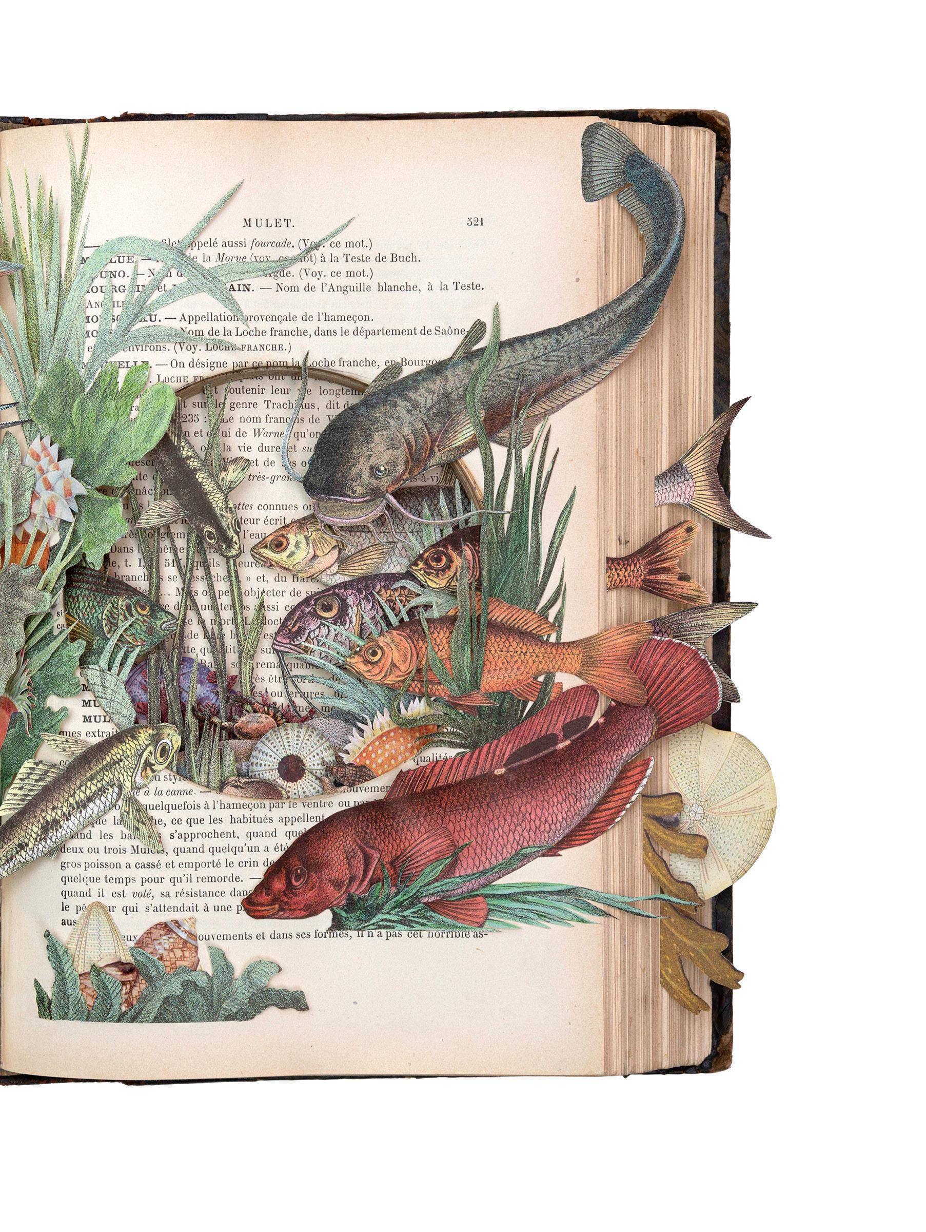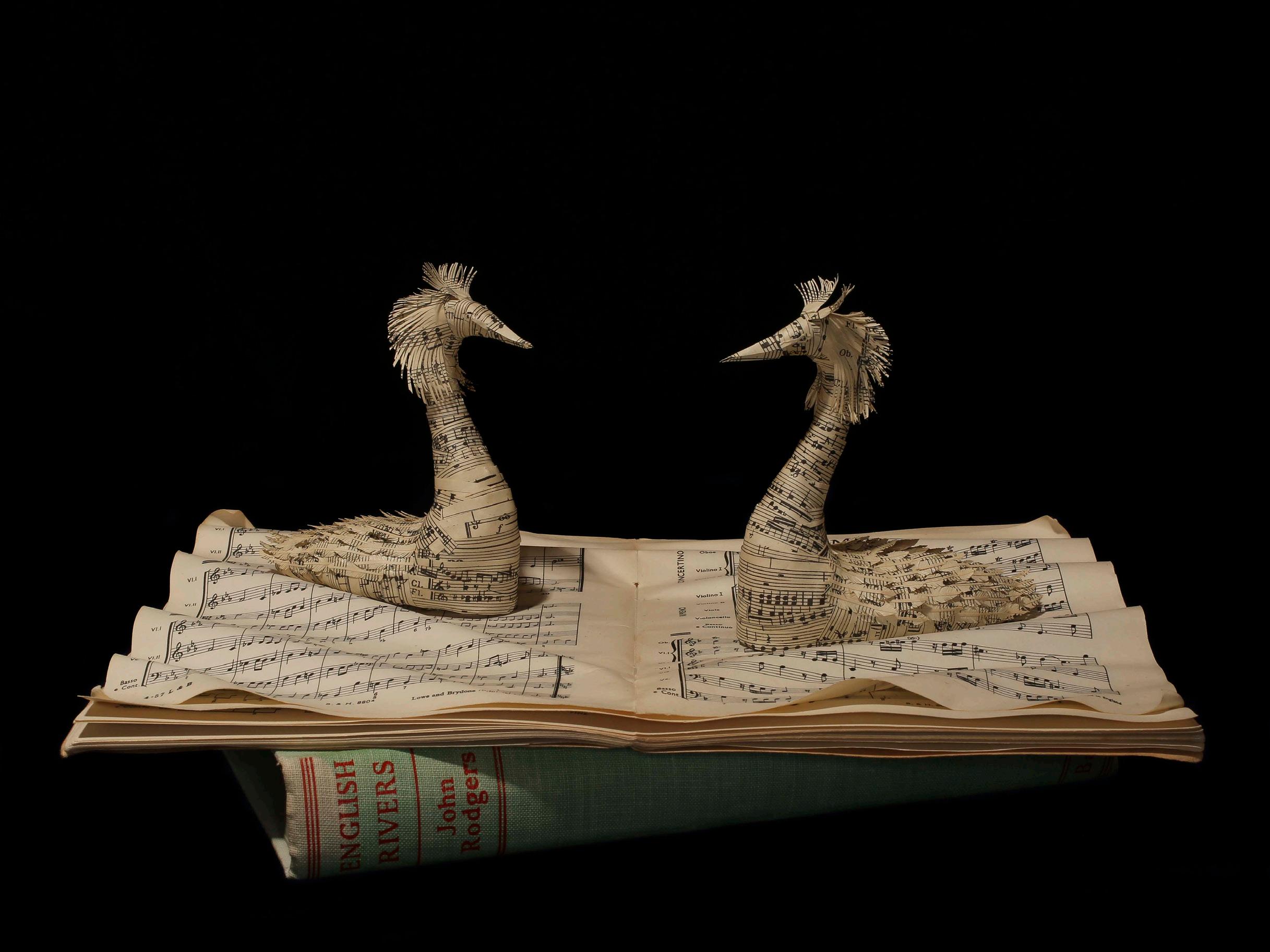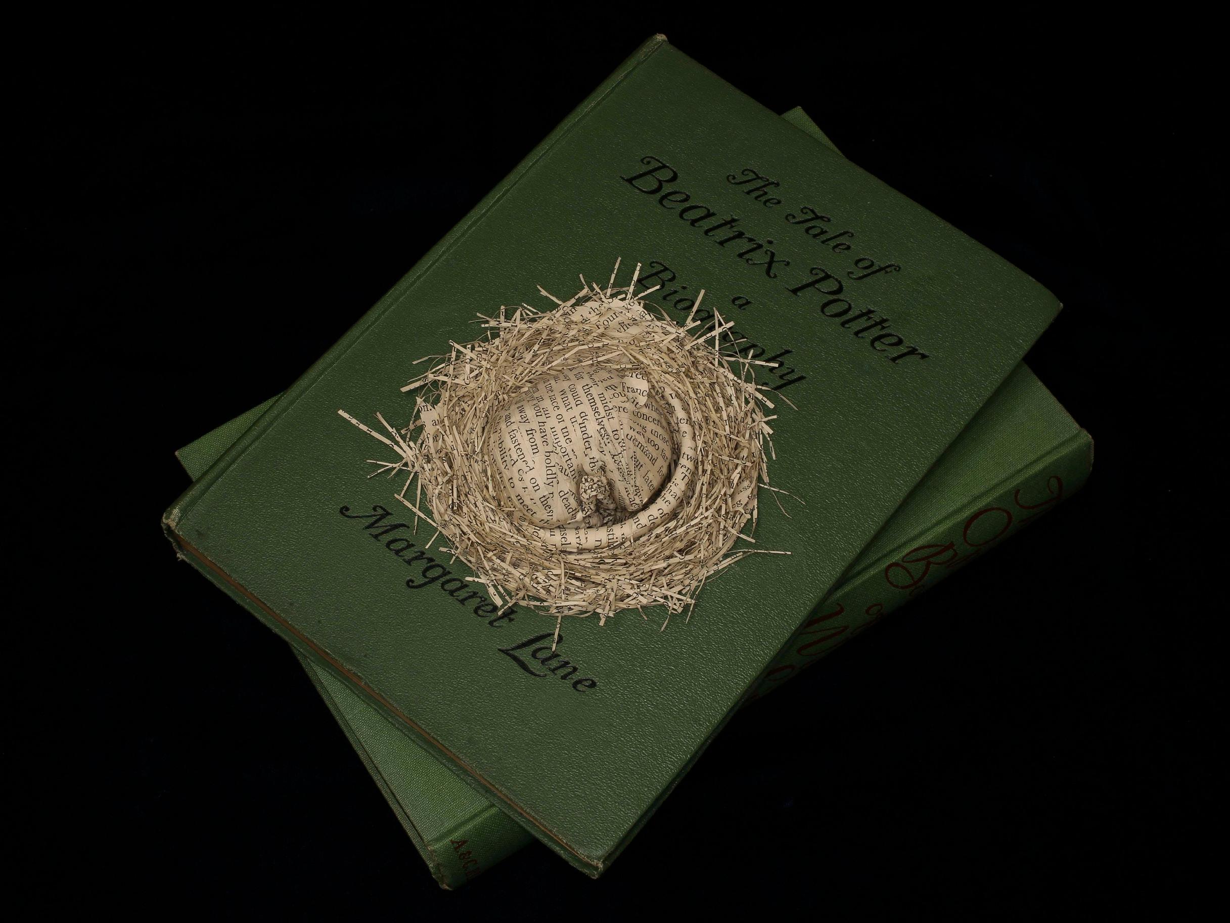 Emma repurposes secondhand books to create intricate sculptures which appear to emerge directly from the paper pages giving life to ideas, information or stories contained within the books. By playing with scale her fascination with detail can be fully realised as fine strips of text are transformed into rigging on a seafaring galleon, printed words become feathers, or singular letters form the bricks of grand buildings.