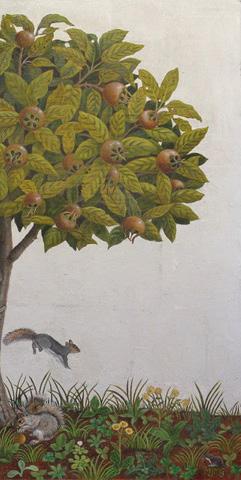 “My work is inspired by the Gothic paintings of Europe and their joyful celebration of an elevated reality. I aspire to their luminous palettes enhanced with the elegance of gold and copper leaf. My imagery is a celebration of the timeless joys of gardens, meadows, birdsong and afternoon tea. These paintings are all on carefully prepared gesso panels, painted in egg tempera; and over painted in oils”.