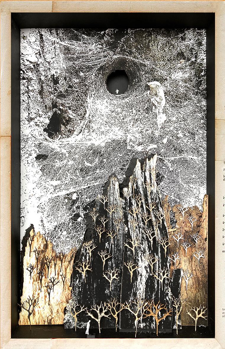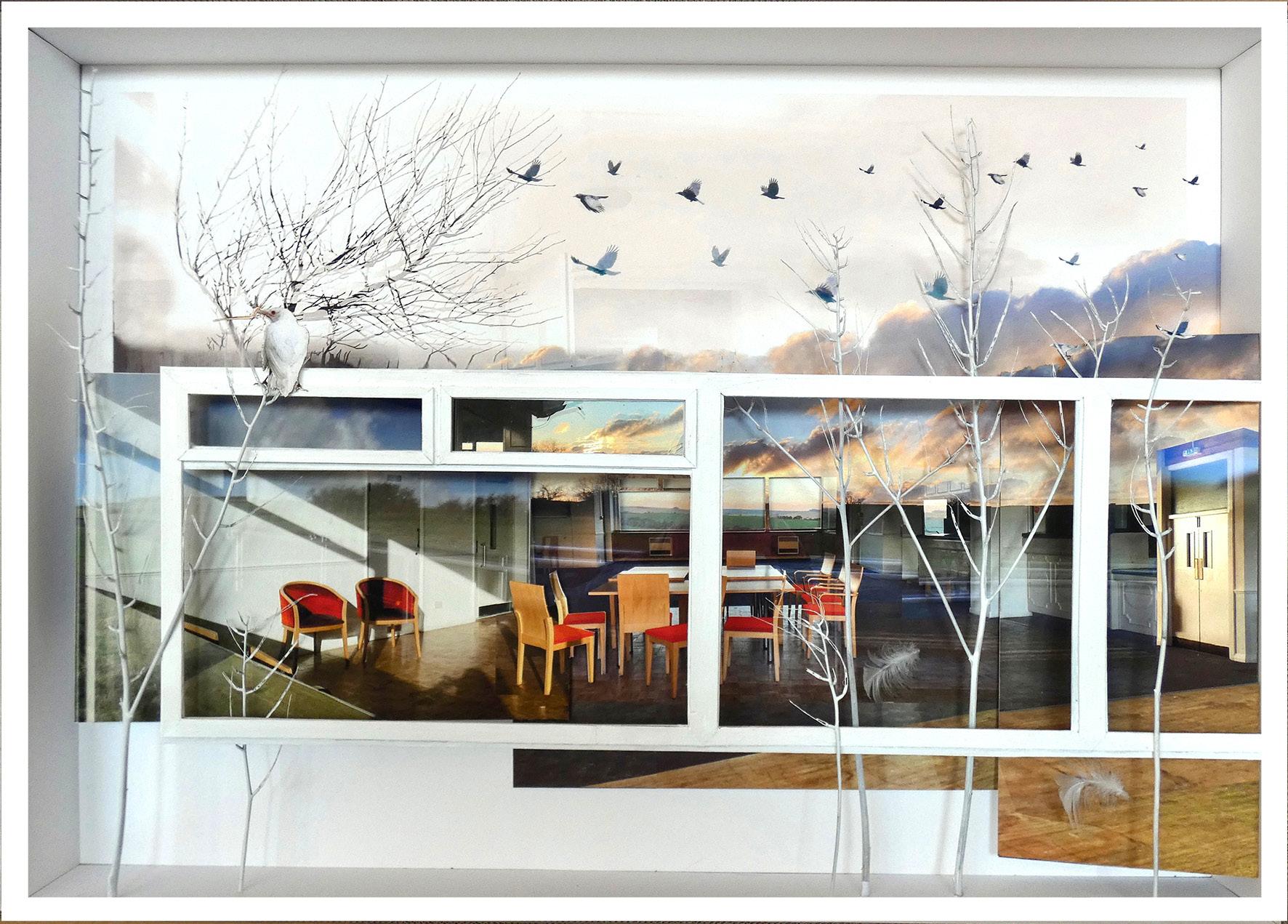 Francis Bloomfield creates fascinating dreamscapes, exquisitely created in three-dimensional collage. Each piece plays with space and perspective to draw the viewer into the artist’s curious imagined worlds. Although her subject matter is drawn from the world we exist in, her work always contains a suggestion of parallel realities. However, the meanings are far from prescriptive and the viewer is invited in to contemplate and reflect upon these mysterious scenarios.