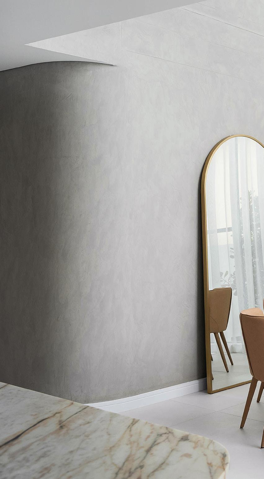 design into reality. The building envelope finished in bespoke Unitex Veneto refined render finish for the exterior walls and curved facade, complimented with Sto venetian plaster finishes for the interior walls.