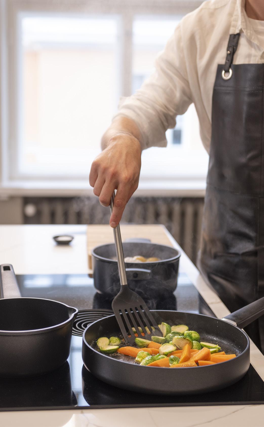 Grafen húðin er mjög endingargóð. Að elda með þessari pönnu er 22% hraðara og orkusparnaður er 15%. Svarta handfangið tryggir gott grip og helst kalt.