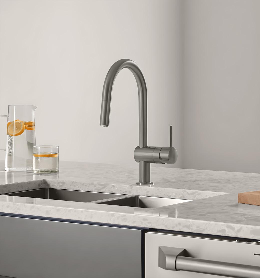 ÚÐARA, DÖKKGRÁTT BURSTAÐ STÁL Útdraganlegur barki og úðari með tveimur stillingum, einfalt að skipta á milli með hnapp. Auðveldar þrif í öllum hornum vasksins og til að skola burt matarleifar af pottum og pönnum.