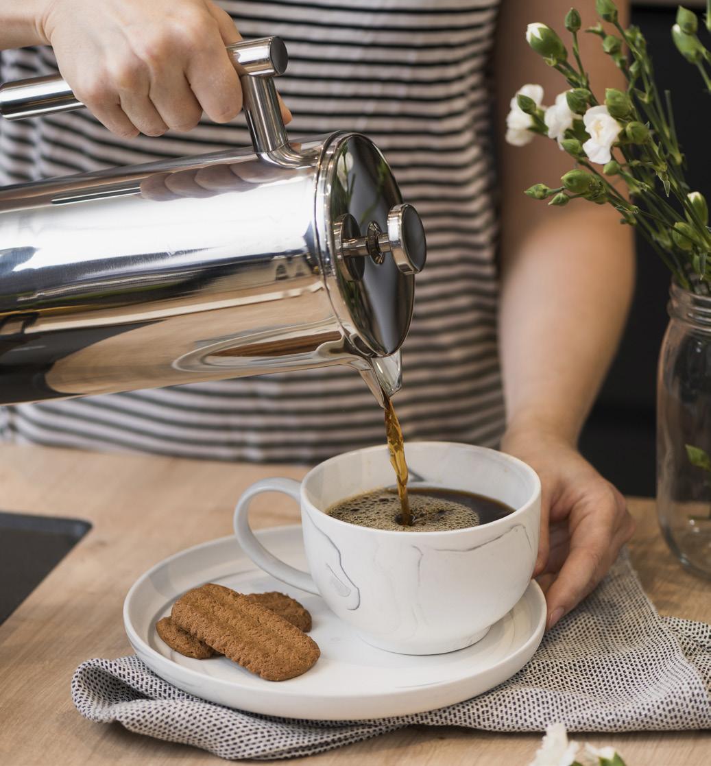 klassísk pressukanna úr ryðfríu stáli. Þökk sé tvíveggja uppbyggingu heldur það vökvanum heitum eða köldum lengur. Með pressunni býrðu til ríkulegt og ilmandi kaffi, það hentar líka vel til að búa til te. Rúmtak 1L. Má ekki fara í uppþvottavél.