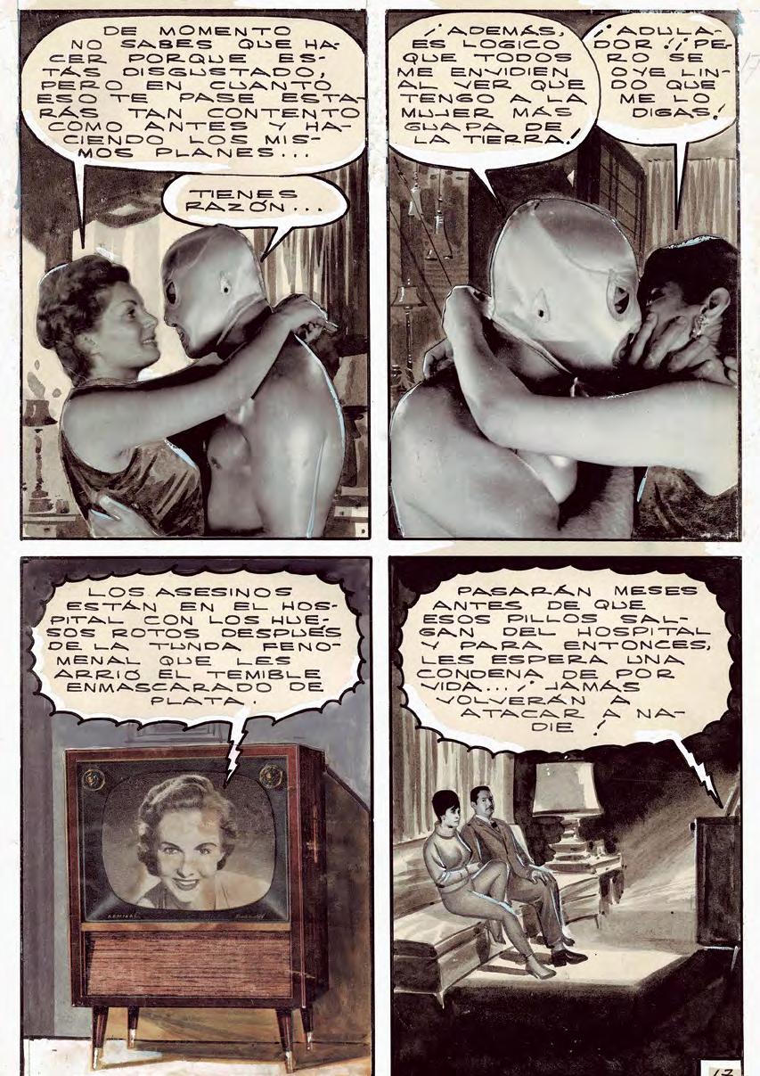 Horacio Robles | Cartón del episodio número 203 de la historieta Santo El Enmascarado de Plata, del 30 de junio de 1964. En su realización se hizo uso de una técnica mixta que combinaba dibujo, pintura, recortes fotográficos y escritura manual. José G. Cruz fue el creador de este fotocómic, que inició su publicación en agosto 1952. Colección Carlos Monsiváis | Museo del Estanquillo.