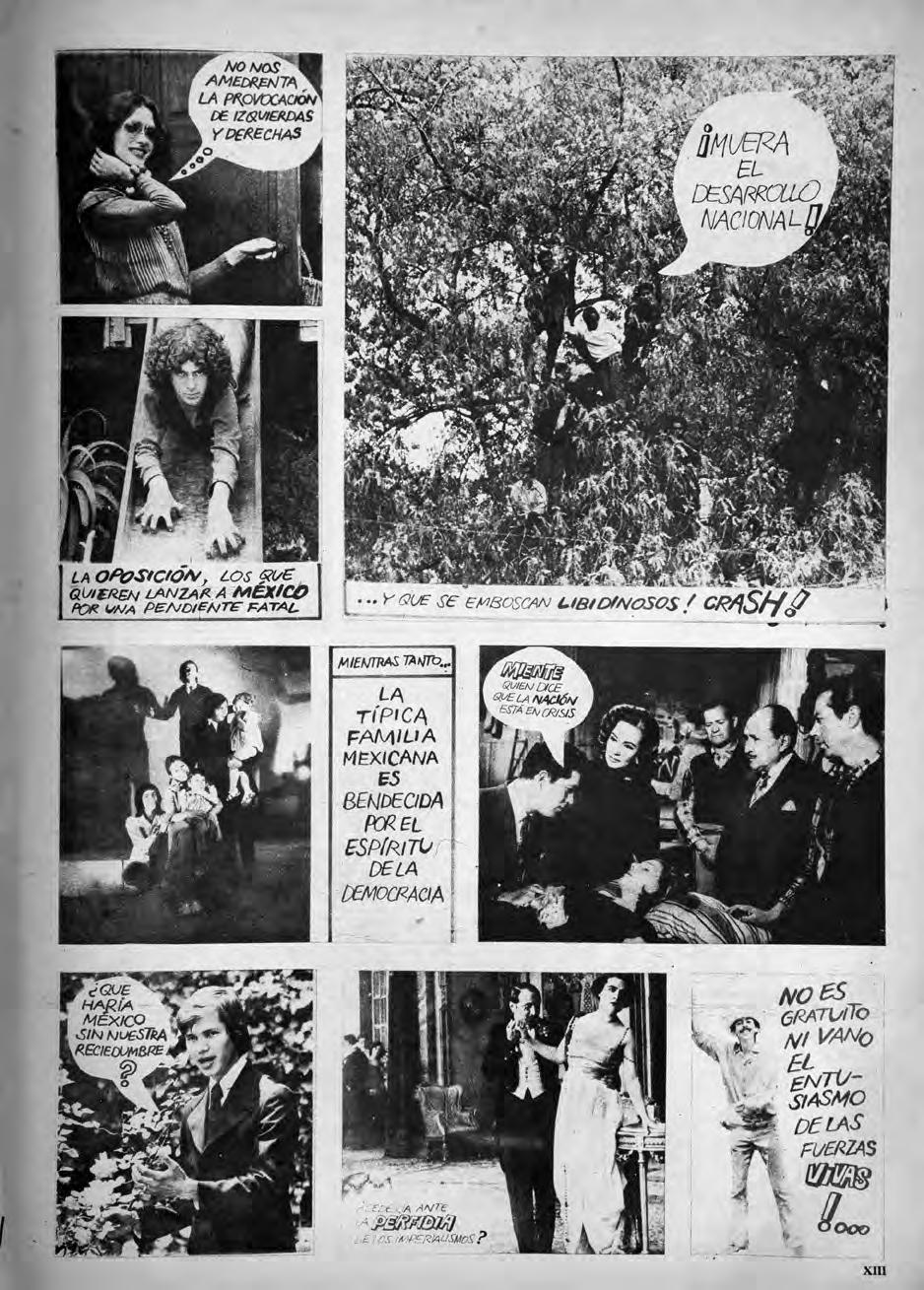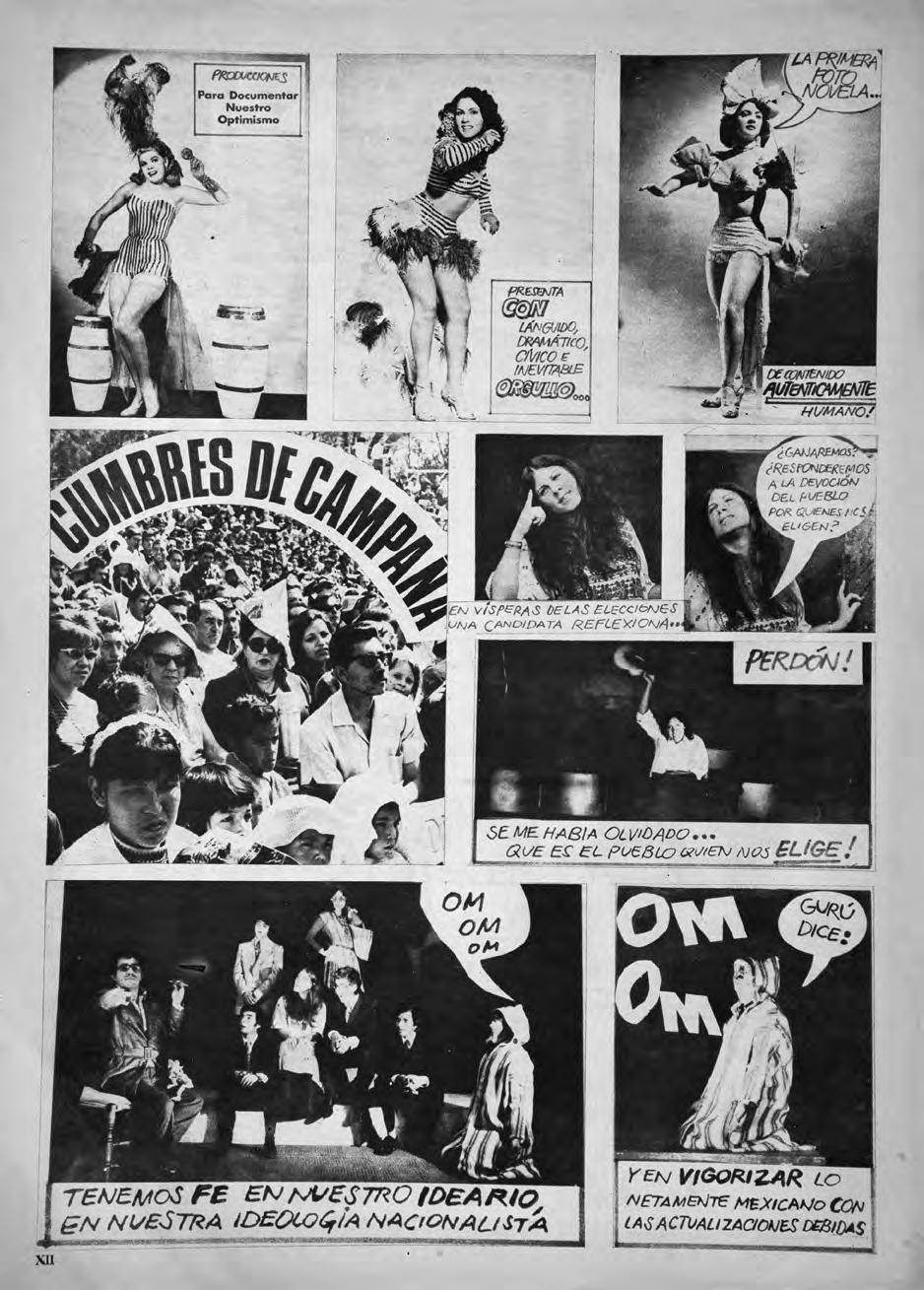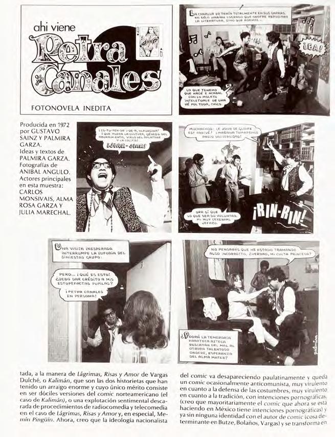 de imágenes preexistentes. En las secciones Para documentar nuestro optimismo, La torre de marfil y Por mi madre, bohemios, que albergó de 1972 a 1987 el suplemento La Cultura en México de la revista Siempre!, Monsiváis republicó viñetas que había extraído de secuencias narrativas de fotonovelas, acompañándolos, a partir de 1974, de comentarios en que se burlaba o exhibía el humor involuntario de sus escenas y parlamentos. De ese modo, en las planas en que el escritor compendiaba semanalmente declaraciones ridículas, penosas, absurdas e infames de personajes públicos, todas ellas apostilladas por la sorna del personaje que inventó como su alter ego —la R.—, se hizo costumbre la presencia no acreditada de fragmentos arrancados a Fiesta, Capricho, Ternura, Chicas, Valle de lágrimas, Almas sin rumbo y otras publicaciones dedicadas al comercio de fotohistorias.