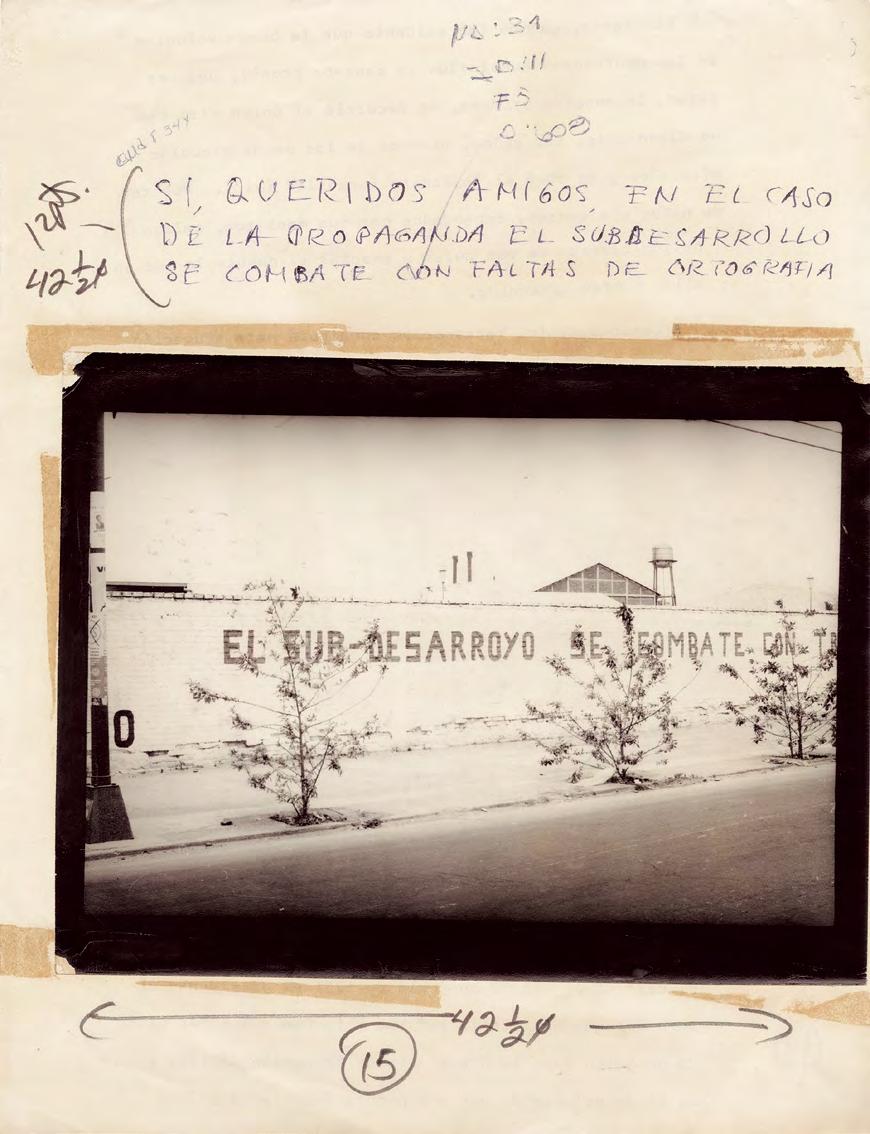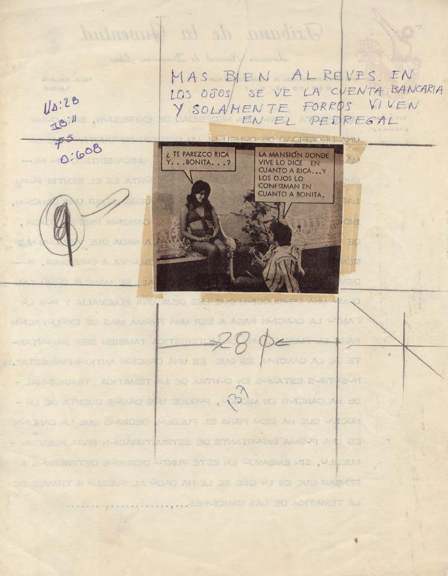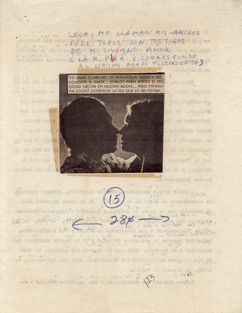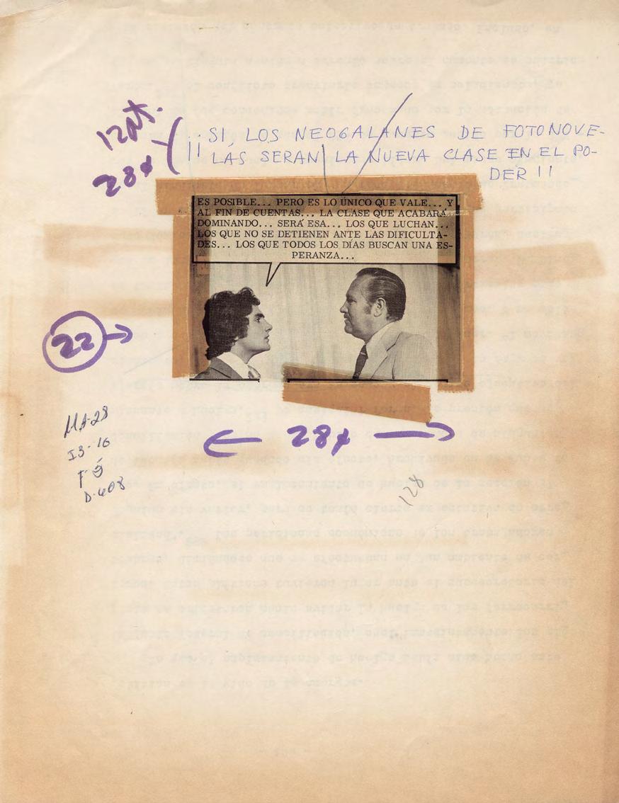 Hoja reciclada con una viñeta extraída de la fotonovela Novelas de amor (núm. 849, del 15 de noviembre de 1976), un comentario manuscrito de Carlos Monsiváis y marcas para formación. La viñeta y el comentario se publicaron en la sección Por mi madre, bohemios del número 774 de La Cultura en México, del 15 diciembre 1976.