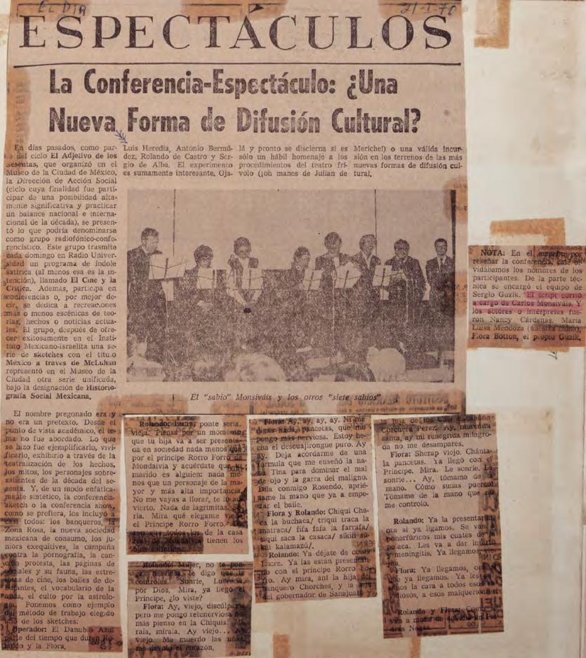 en Por mi madre, bohemios. Los huecos que dejaron las viñetas extraídas no impiden el seguimiento de los relatos originales, en los que campean los personajes, temas y tratamientos que caracterizaron a la fotonovela mexicana de los años setenta y ochenta. Vicente Rojo puso en custodia del galerista y coleccionista Ramón López Quiroga varias decenas de esos cuadros y otros retazos de impresos, pegados con cinta adhesiva en hojas recicladas de tamaño carta, con anotaciones de puño y letra de Monsiváis, que se publicaron entre enero de 1976 y julio de 1977, años en que el diseño de La Cultura en México era responsabilidad de Bernardo Recamier. El cotejo entre estos documentos difíciles de clasificar, los ejemplares mutilados de donde provienen sus viñetas y las planas del suplemento en que los recuadros fueron reeditados, permite asomarnos a la mesa de trabajo de un intelectual que se caracterizó por su extraordinaria capacidad para relacionar manifestaciones culturales disímiles.