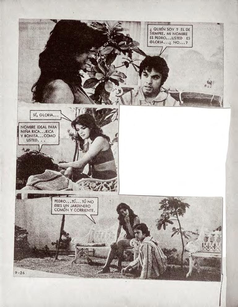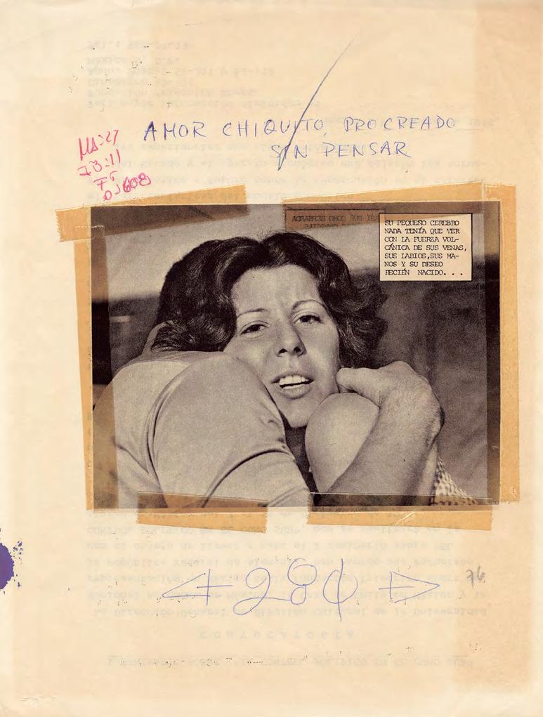 Página de la fotonovela Novelas de amor (núm. 840, del 13 de septiembre de 1976) con el hueco de la viñeta que Carlos Monsiváis recortó. A la derecha la hoja en que montó esa pieza y le agregó un comentario, mismo soporte sobre el que se hicieron las marcas para su formación. El montaje apareció en la sección Por mi madre, bohemios del número 765 de La Cultura en México, del 12 de octubre de 1976. Fondo hemerográfico y documental de Carlos Monsiváis | Biblioteca de México José Vasconcelos. Archivo de la Galería López Quiroga.