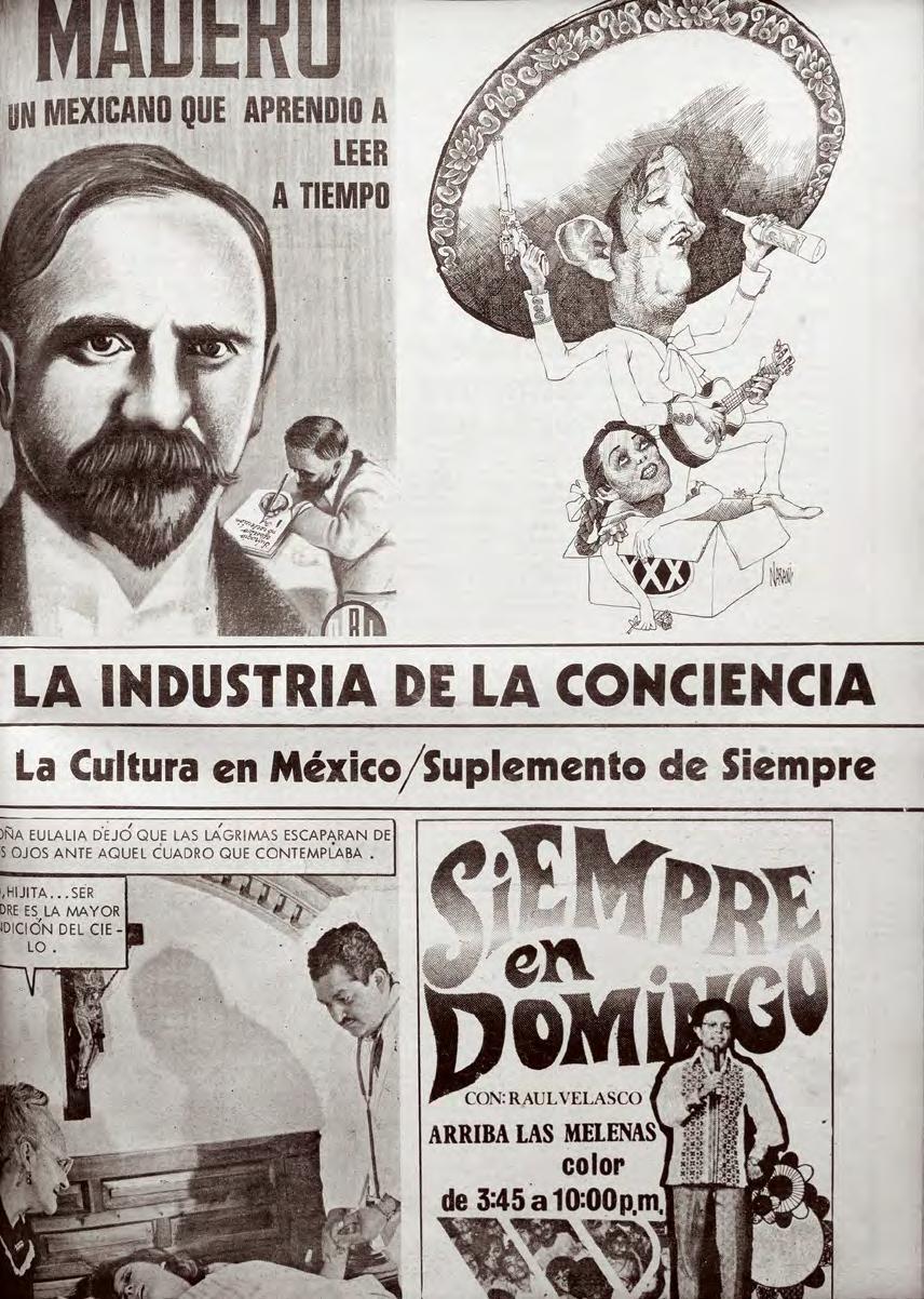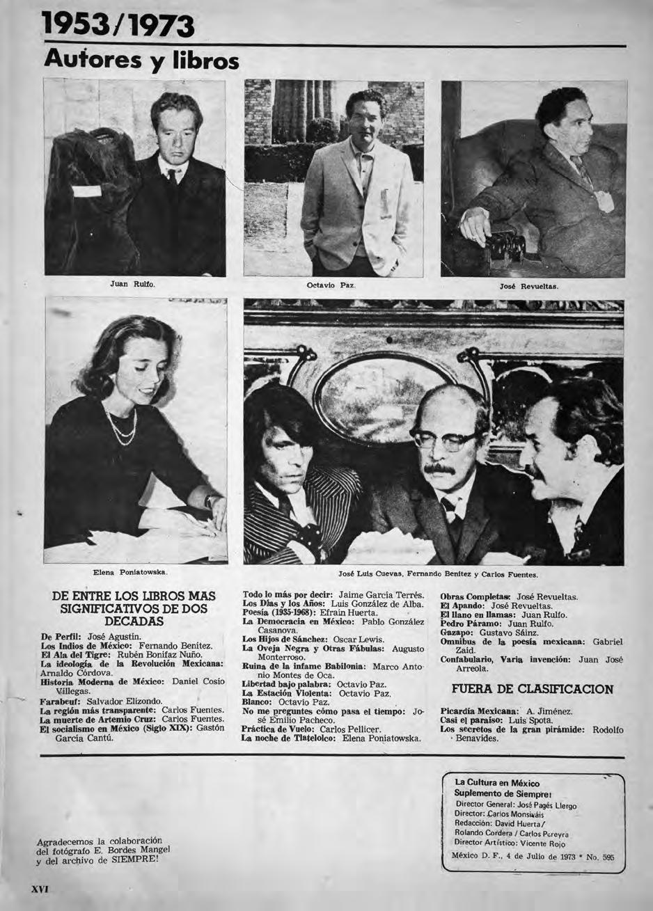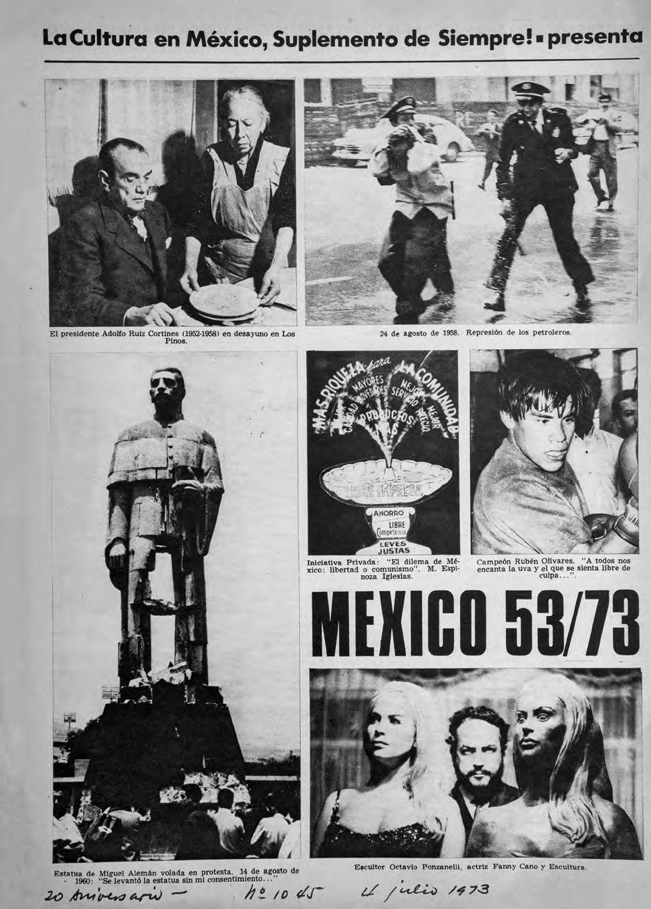 Págs. 443-458 | Portada, páginas interiores y contraportada del número 1045 de La Cultura en México, del 4 de julio de 1973. Edición realizada con motivo del xx aniversario de la creación del semanario Siempre! Archivo Alfonso Morales.