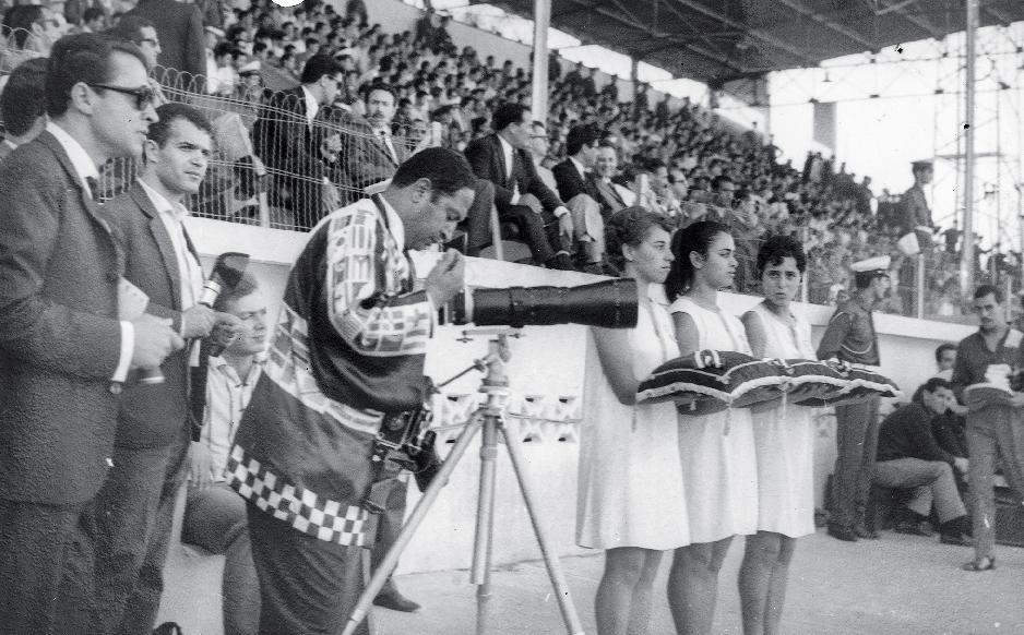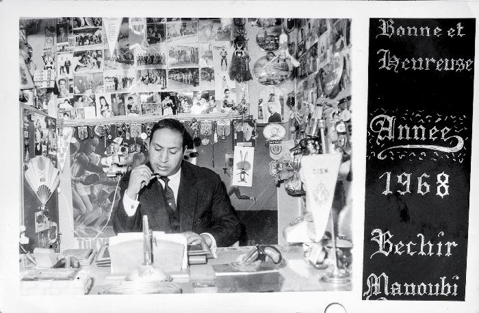 Béchir Manoubi. Retrato de Béchir Manoubi en su estudio Photo Sportif, ubicado en Túnez, incluido en una tarjeta en que el fotógrafo expresó sus buenos deseos para el año 1968. Archivo General de la Nación. Fondo Comité Organizador de los xix Juegos Olímpicos.