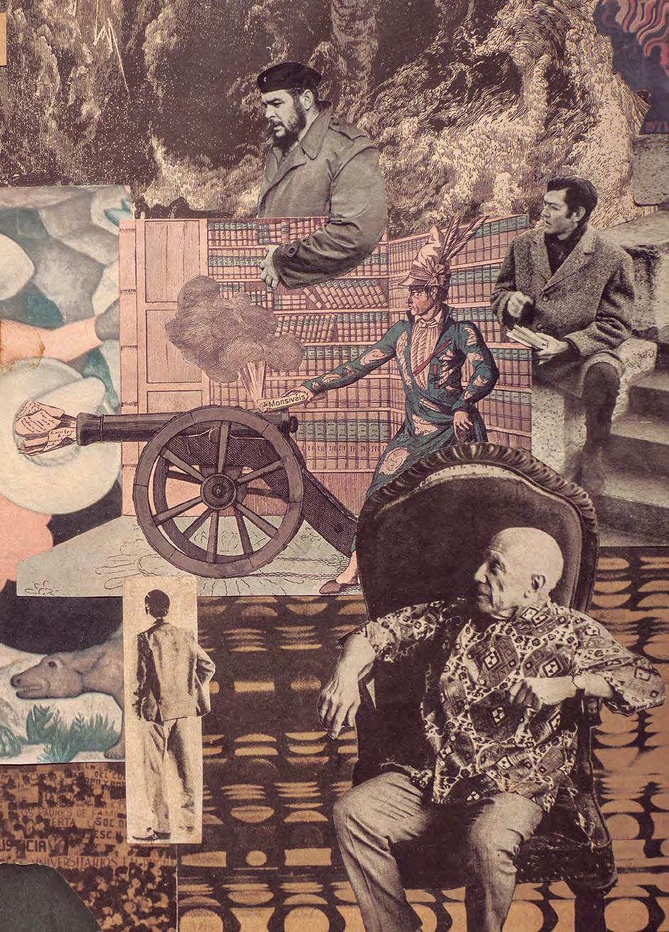 Págs. 4-5 | Collage que Fernando Zertuche obsequió a Carlos Monsiváis en diciembre de 1974. El retrato del escritor fue realizado por Shet Morris y se publicó en la entrega número 4 de la revista Dos. Él y Ella, de diciembre de 1969. Imágenes de Charles Chaplin, Ho Chi Minh, Ernesto Che Guevara, Julio Cortázar y Pablo Picasso forman parte del ensamble iconográfico. Museo del Estanquillo | Colecciones Carlos Monsiváis.