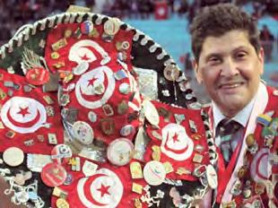 derecha arriba | Autor no identificado | Primera aparición pública de Hosni Manoubi llevando un sombrero de charro como el que usaba Béchir Manoubi. Hosni sostiene el retrato en el que se ve a su padre, recién fallecido, con el atavío que presentó en los Juegos Olímpicos de Alemania, en 1972, y que se volvió tradición familiar. Estadio Menzah, Túnez, 2005. Cortesía Hosni Manoubi.