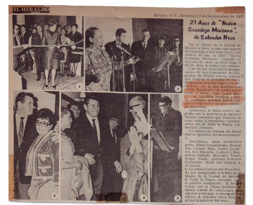 Acervo Centro de la Imagen, Archivo General de la Nación, Archivo fotográfico Rodrigo Moya, Archivo Gurrola. Fundación Gurrola, A. C., Biblioteca de México José Vasconcelos, Biblioteca Miguel Lerdo de Tejada de la shcp, Centro Fotográfico Manuel Álvarez Bravo, Fototeca Nacional sinafo-inah, Fundación María y Héctor García A. C., Fundación Televisa, Galería Arvil, Galería López Quiroga, Instituto de Investigaciones sobre la Universidad y la Educación-unam, Colección Carlos Monsiváis | Museo del Estanquillo, Profética, Casa de la Lectura, Diario La Jornada, Revista Proceso, Revista Siempre!