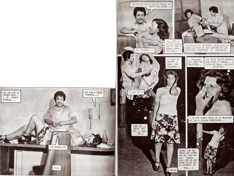 d) Hay que diferenciar a la fotonovela sentimental de otra, más feroz y abiertamente sexista que inició con éxito omnívoro, la desaparecida Casos de Alarma! Sin declarar su ambición pornográfica, esta fotonovela prohibida por la censura (que en su momento de mayor éxito llegó a vender un millón doscientos mil ejemplares a la semana y cuyos procedimientos hoy continúan diferentes publicaciones) se allegó su éxito gracias al despliegue del tremendismo, a la comercialización de esa avidez por la nota roja, que es (simultáneamente) el amor por las revelaciones de un oculto melodrama y la complacencia sutil ante la muerte ajena o la violencia ejercida sobre otros. En estas fotonovelas el sexismo es una escuela, una incitación a la conducta límite, una negación de la humanidad de las minorías y un continuo abatimiento de la dignidad femenina. Su voraz difusión prueba entre otras cosas que el formato semicinematográfico de la fotonovela estimula enormemente a quienes no pueden ver en el cine, por razones de censura o de escasa información, los argumentos sanguinolentos y sensacionalistas que se correspondan con una idea muy difundida masivamente de la pasión y el erotismo.