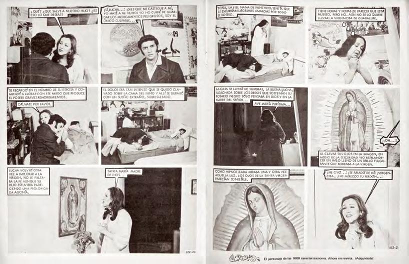 Páginas del episodio “La tonta”, de la fotonovela Valle de lágrimas! (núm. 87, del 21 de diciembre de 1976), que fueron recortadas por Carlos Monsiváis. A la derecha la manera en que intervino una de las viñetas extraídas. El resultado se publicó en la sección Por mi madre, bohemios del número 777 de La Cultura en México, del 5 de enero de 1977. Fondo hemerográfico y documental de Carlos Monsiváis | Biblioteca de México José Vasconcelos. Archivo de la Galería López Quiroga.