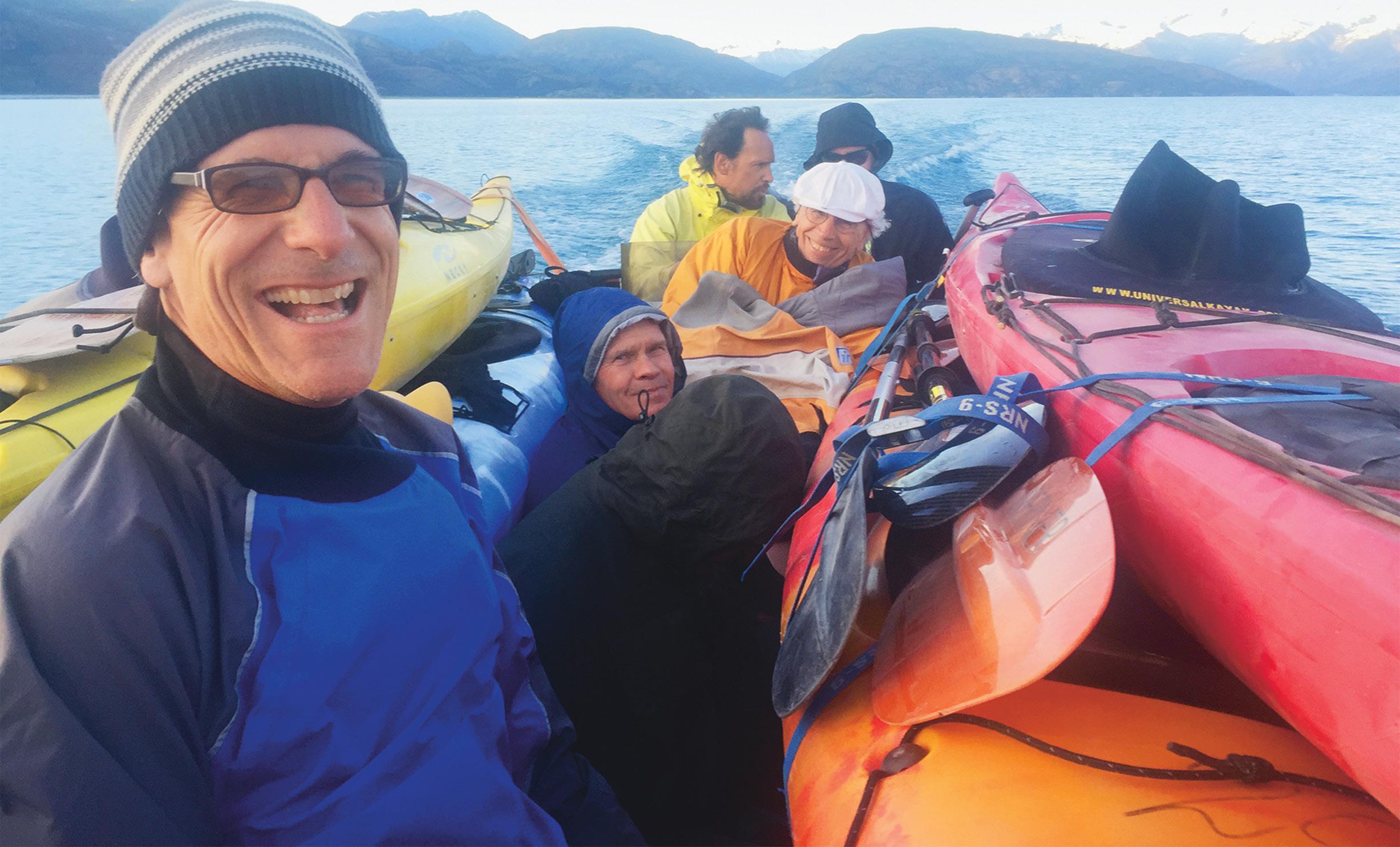 Jib Ellison takes a self-portrait of the Do Boys — including Rick, center, in blue — crossing Lago General Carrera.