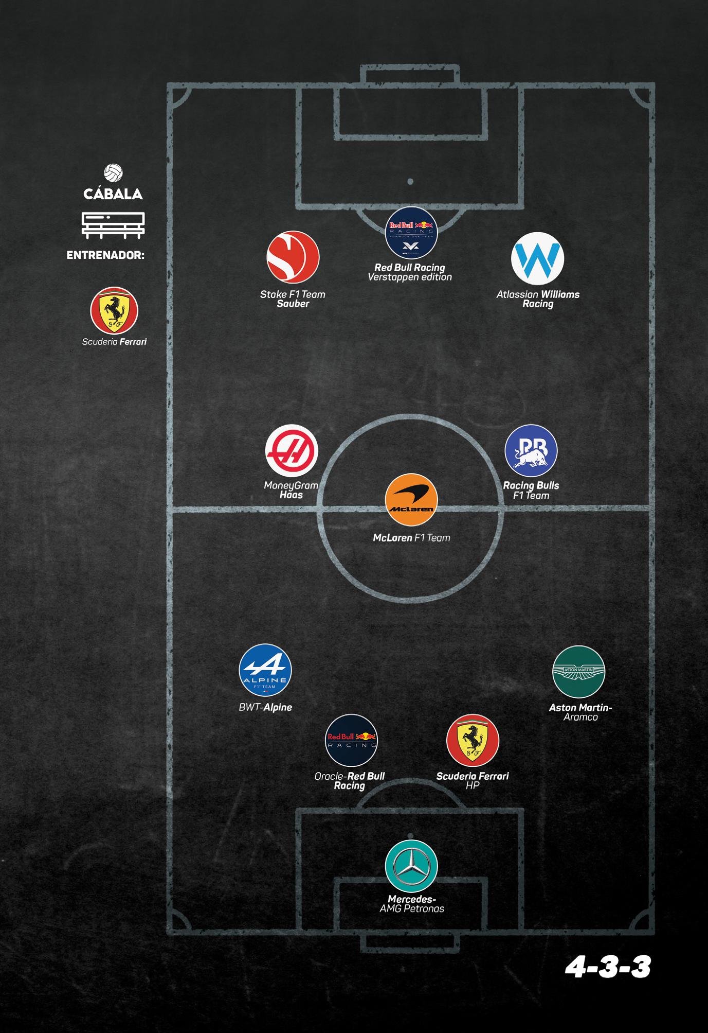 Mercedes ataja con la seguridad de un arquero campeón, mientras que en defensa Aston Martin aporta elegancia, Red Bull agresividad y Ferrari el peso de su historia. Alpine completa la línea defensiva con constancia y solidez. En el medio, McLaren es el cerebro del equipo, Haas el obrero incansable y RB (ex Toro Rosso) el joven talentoso que brilla a ratos.