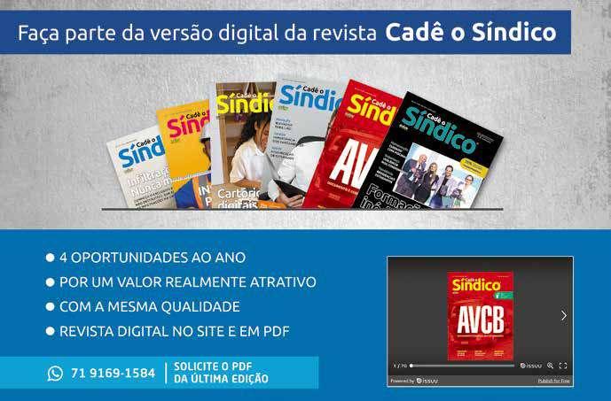 Rua Francisco Gonçalves, 1, Edf. Reitor Miguel Calmon, sala 303 CEP: 40015-090 Comércio - Salvador/BA - Tel.: (71) 3242-1084 / 3491-0710 revista@cadeosindico.com.br