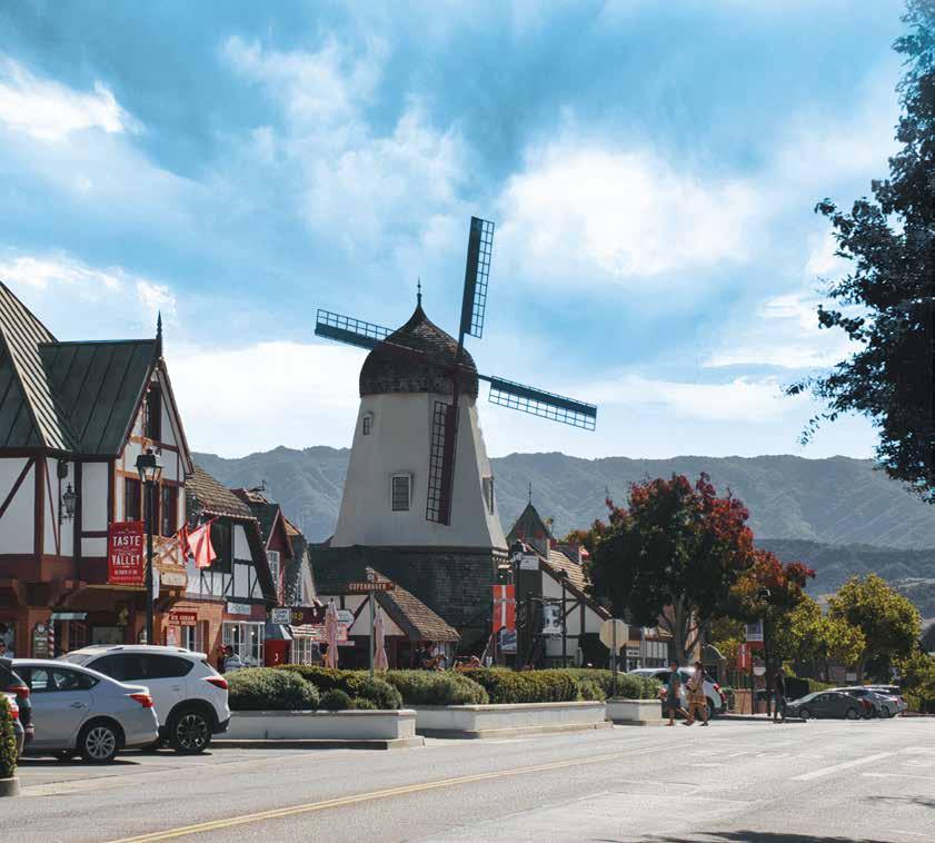 destination: Solvang. A slice of Denmark in California, Solvang exudes a distinctive charm, where traditional windmills stand tall against the blue sky and the aroma of Danish pastries wafts through the air. The streets are lined with halftimbered houses, boutiques, and bakeries, all showcasing a piece of Danish heritage.
