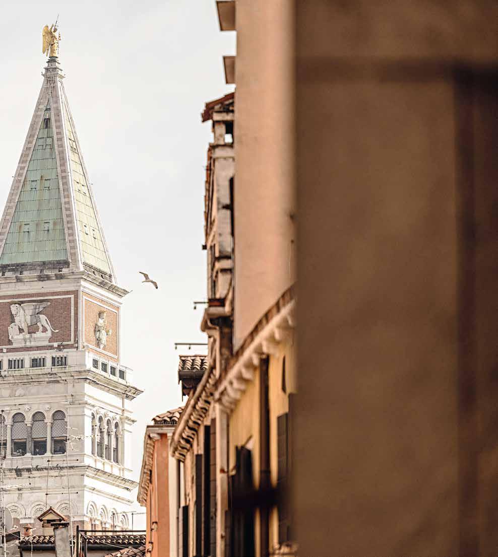 dem allgemeinen Trampelpfad den Rücken zu kehren und nur wenige Schritte weiter den Charme der von Kirchen und Adelshäusern, Terrassen-Cafés und kleinen Läden gesäumten Campi zu entdecken. Venedig-Kenner warten geduldig bis zum Abend, bevor sie zu langen Spaziergängen und Entdeckungstouren aufbrechen, natürlich nicht ohne einen Spritz oder Prosecco mit grandioser Aussicht auf einer der vielen schönen Sommerterrassen. Es ist auch die beste Zeit für einen Schaufensterbummel entlang der Calle Larga XXII Marzo, wo italienische und internationale Luxuslabel ihre begehrlichen Waren präsentieren, darunter die teuersten Juweliere der Stadt. Für alle, die eine Parkbank zum Ausruhen suchen, gibt es die nach fünf Jahren Restaurierung 2019 wiedereröffnete Parkanlage Giardini Ex Reali mit einem stimmungsvollen Kaffee-Pavillon. „Venedig ist eine Stadt zum Spazierengehen“, sagte Hemingway. Das ist lange her, aber es stimmt immer noch.