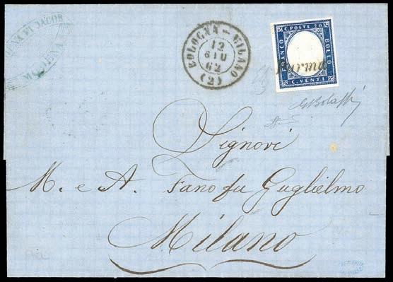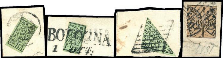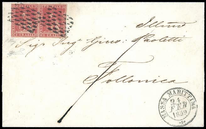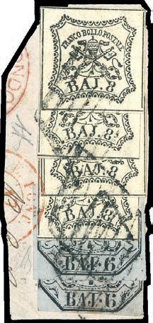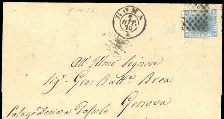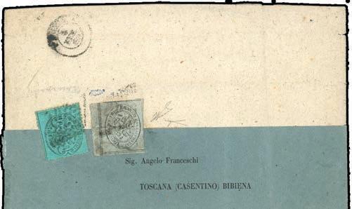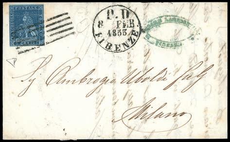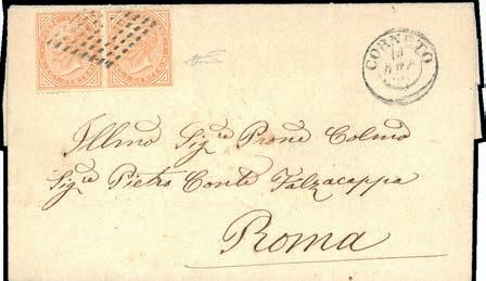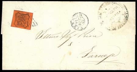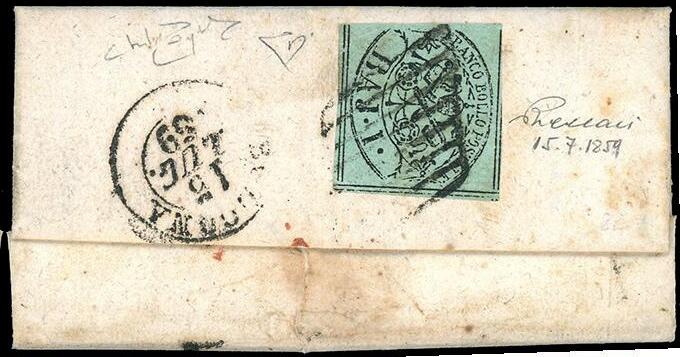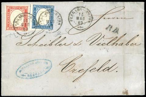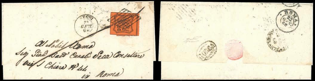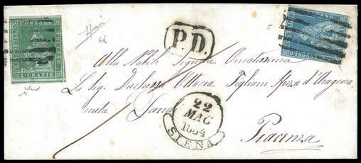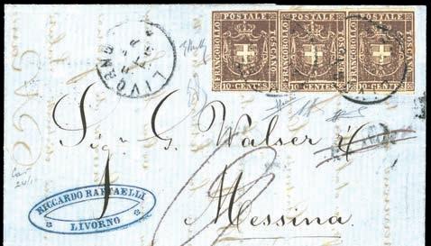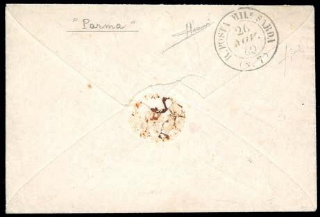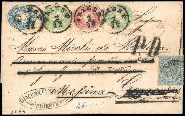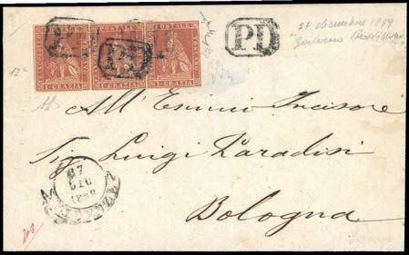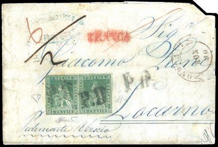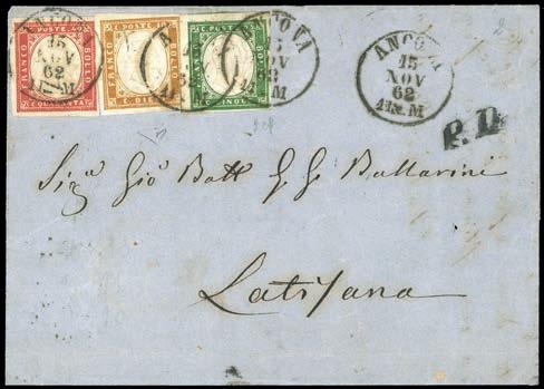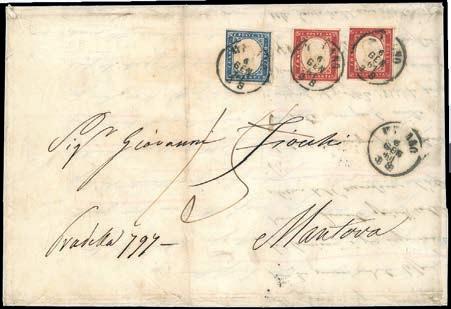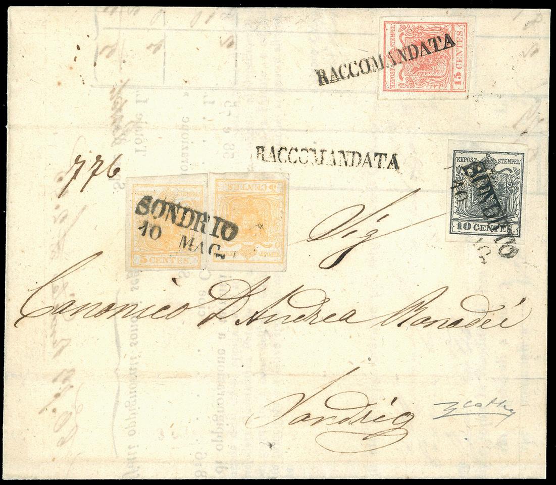 1856 - 5 cent. giallo arancio chiaro, due esemplari, 10 cent. nero, tutti carta a mano, e, al verso per il diritto di raccomandazione, 15 cent. rosso vermiglio chiaro, III tipo, carta a macchina (1f,2,20a), perfetti, su lettera raccomandata di doppio porto da Sondrio 10/5/1856 per città. Rara affrancatura tricolore, impreziosita dalla pregevole tariffa. Cert. Colla.