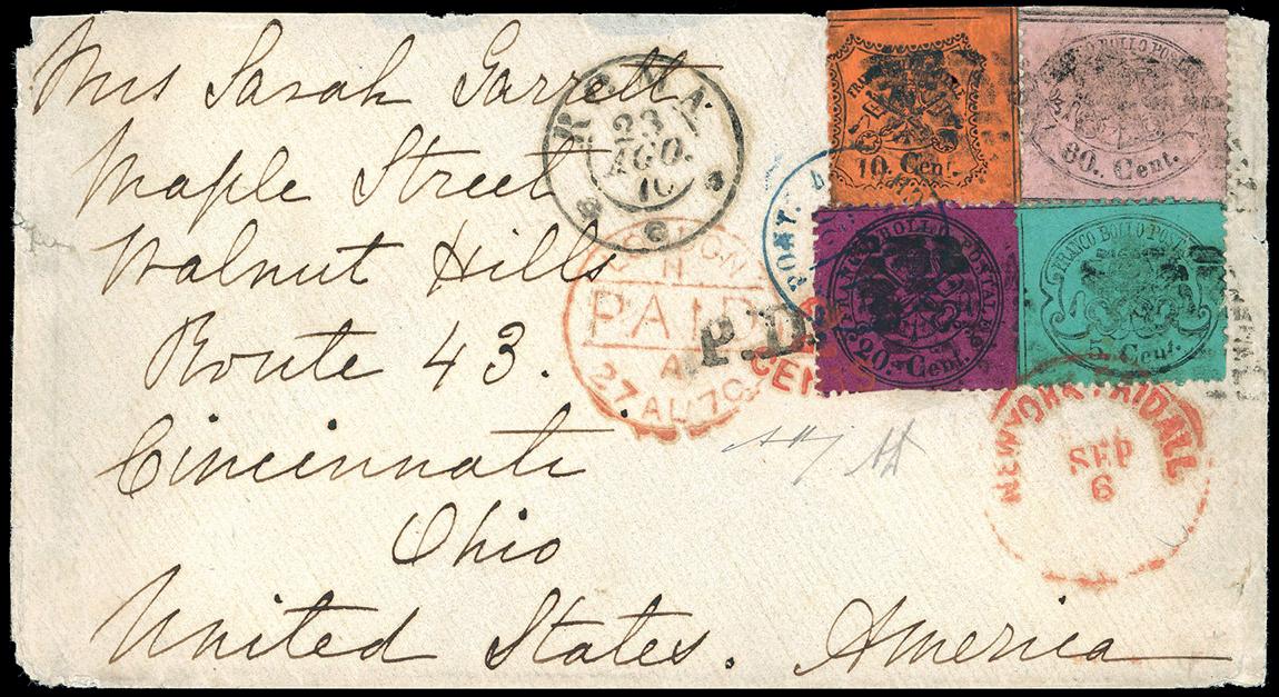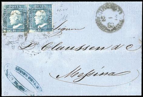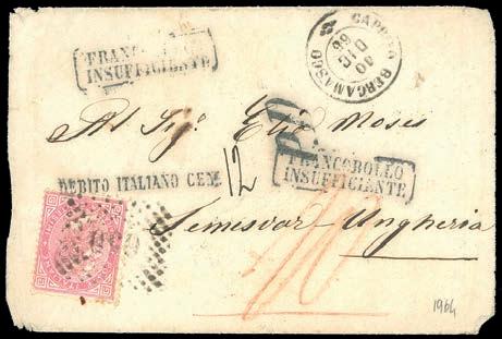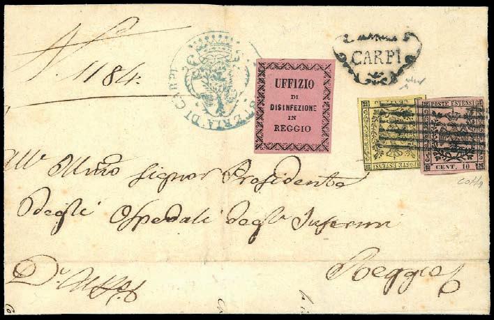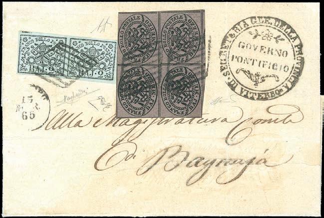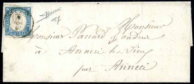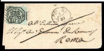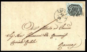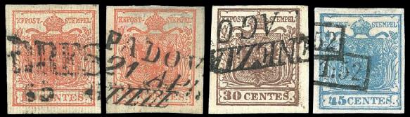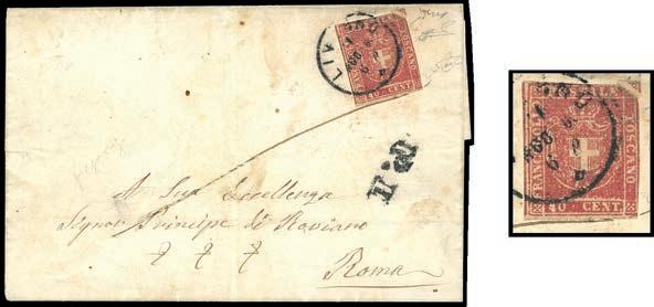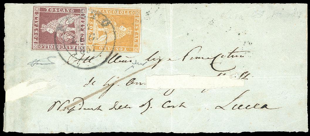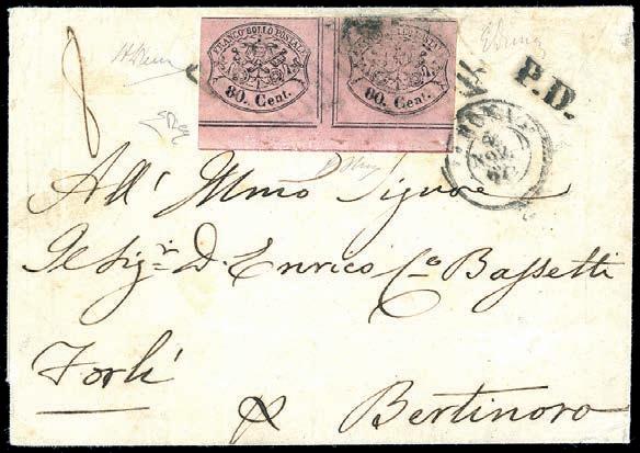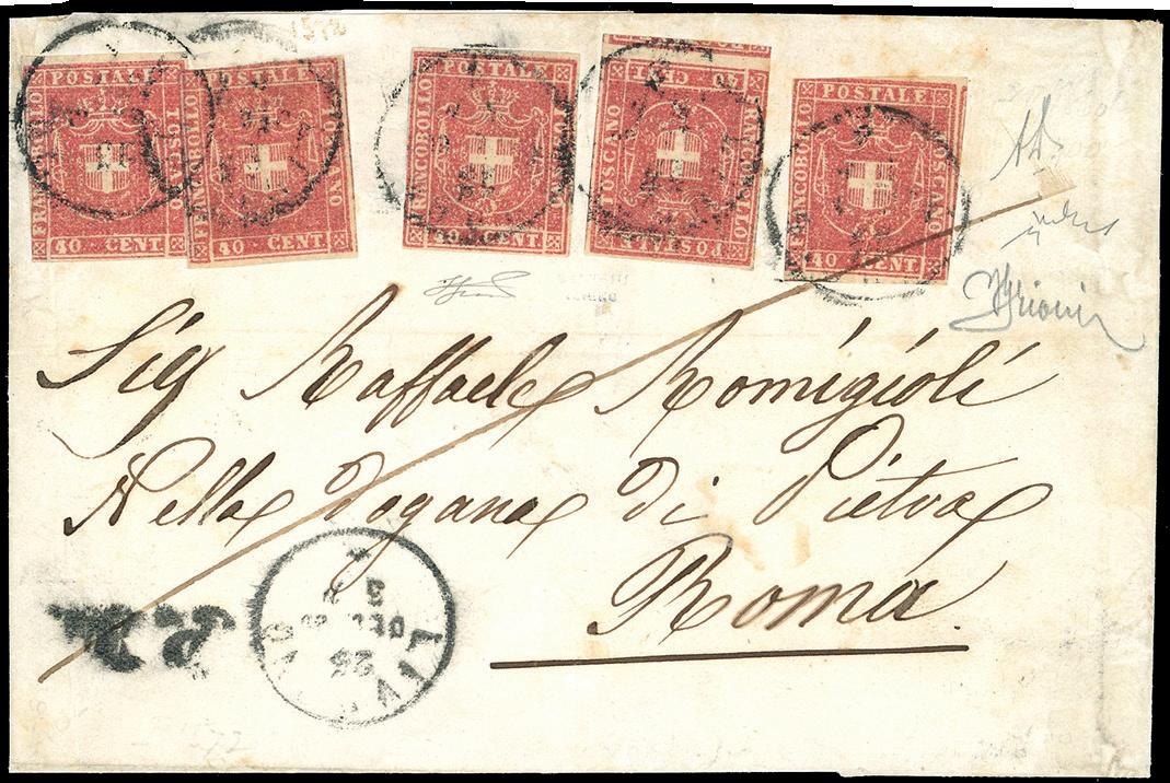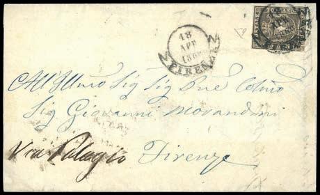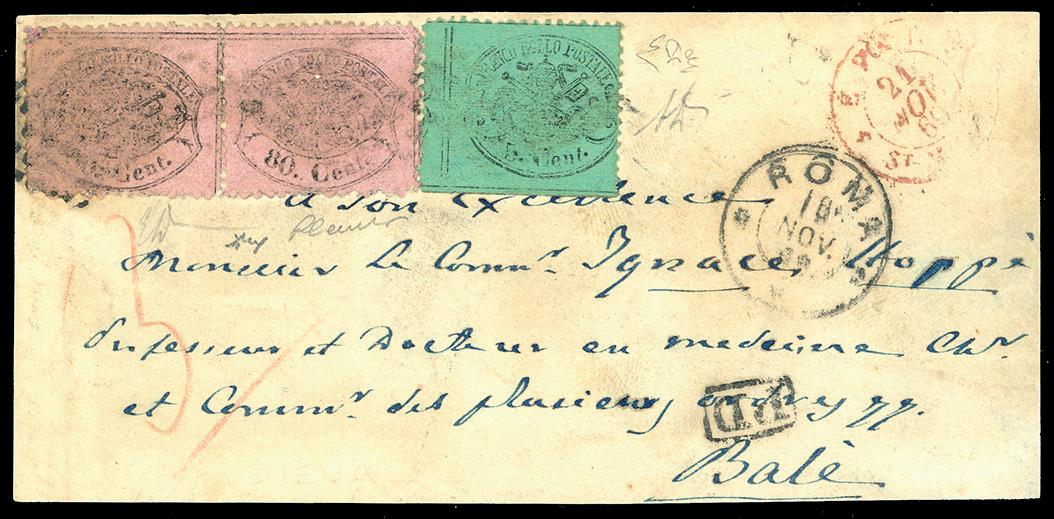 1856 - 5 cent. giallo arancio chiaro, due esemplari, 10 cent. nero, tutti carta a mano, e, al verso per il diritto di raccomandazione, 15 cent. rosso vermiglio chiaro, III tipo, carta a macchina (1f,2,20a), perfetti, su lettera raccomandata di doppio porto da Sondrio 10/5/1856 per città. Rara affrancatura tricolore, impreziosita dalla pregevole tariffa. Cert. Colla.