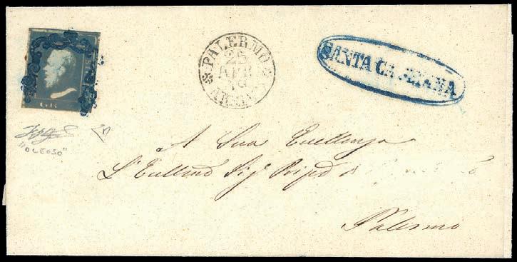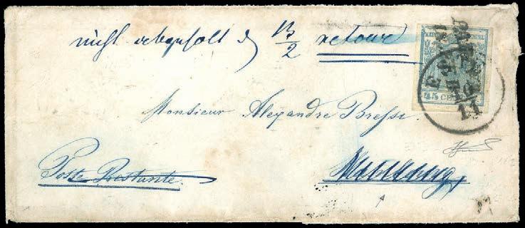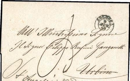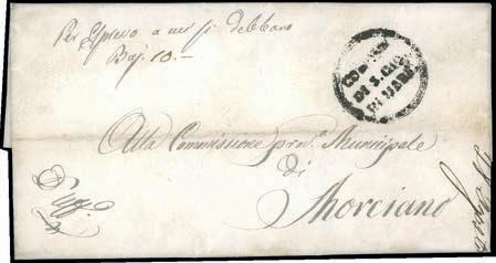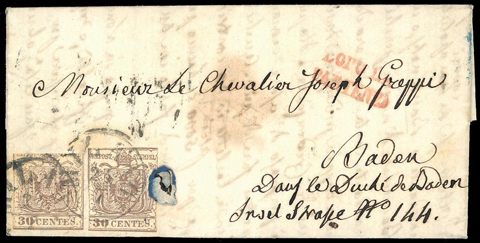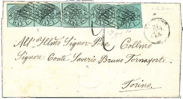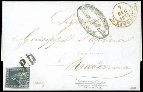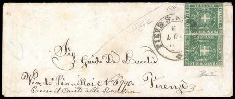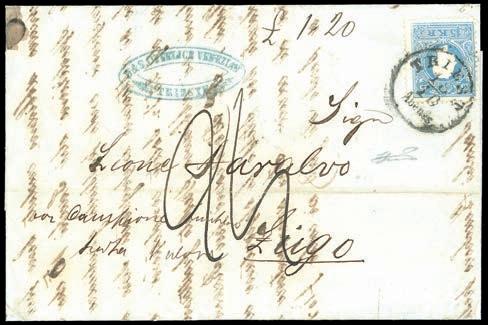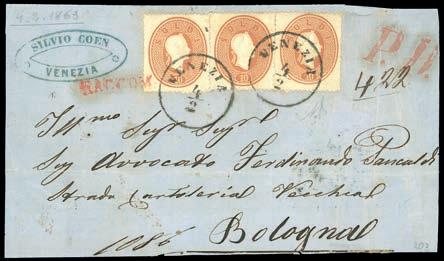 1950 - 5 cent. giallo, I tiratura (1a), tre esemplari, perfetti, applicati per errore al verso, in contrasto con il rEGEOlamento postale, di lettera da Venezia 20/8/1850 a Busco, Oderzo. Insieme interessante e raro. A.Diena, Colla. Cat. ! 14.250++