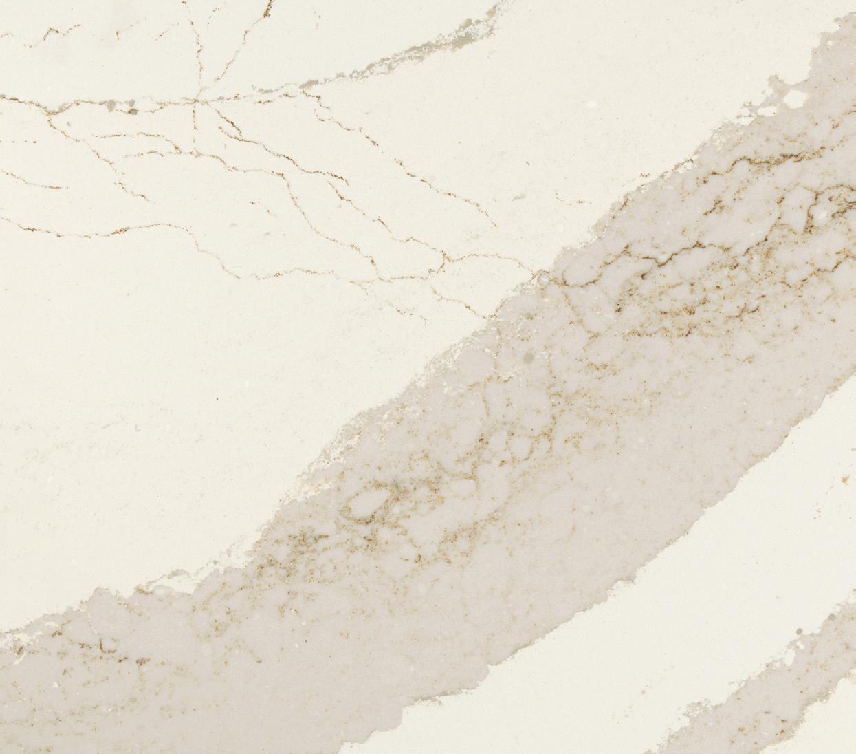 BRITTANICCA WARM™ features warm, translucent gray veins that stream across a temperate white backdrop like venerable old rivers flowing into a fog-bound harbor.