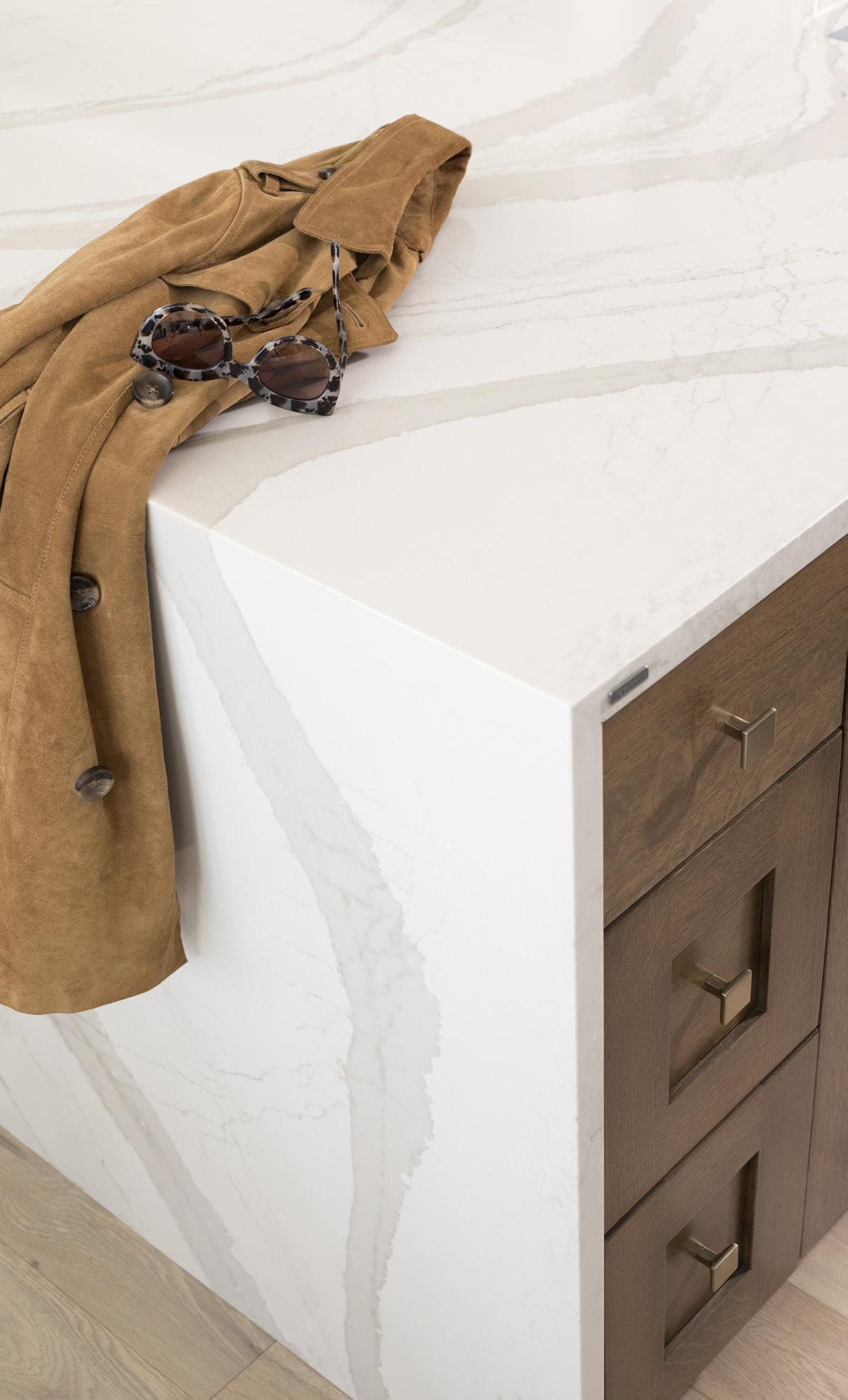 EDGY DESIGN. Extend the beauty of this design from counter to floor with a stunning waterfall edge.