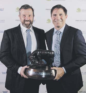 The Centaine Award for champion New Zealand-based sire by total progeny earnings worldwide went to Little Avondale Stud’s Per Incanto. Pictured with the trophy is Little Avondale’s Sam Williams, right, with Mark Chittick of Waikato Stud finally handing over the trophy having held it since 2015 with Savabeel.