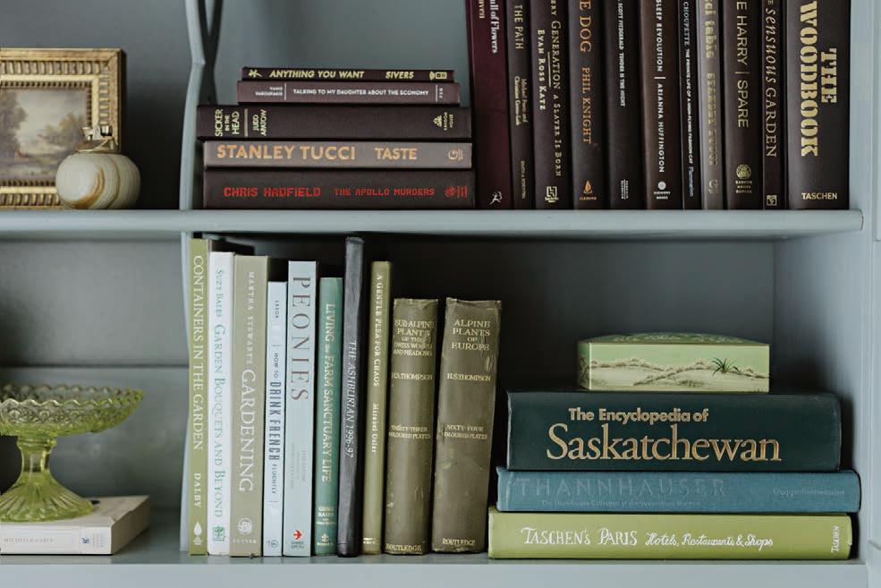 And while she’s found plenty of happiness tending to roses, dahlias and ranunculus over the past few years, there’s just as much to love inside the craftsman-style home. Their second-floor library, for one, has become another happy place for the creative couple. Leo is a woodworker (he crafts custom furniture and adorable dollhouses with his company, Fallen Tree BC) and used his talents to install a wall of shelving that he painted a custom shade of robin’s-egg blue.