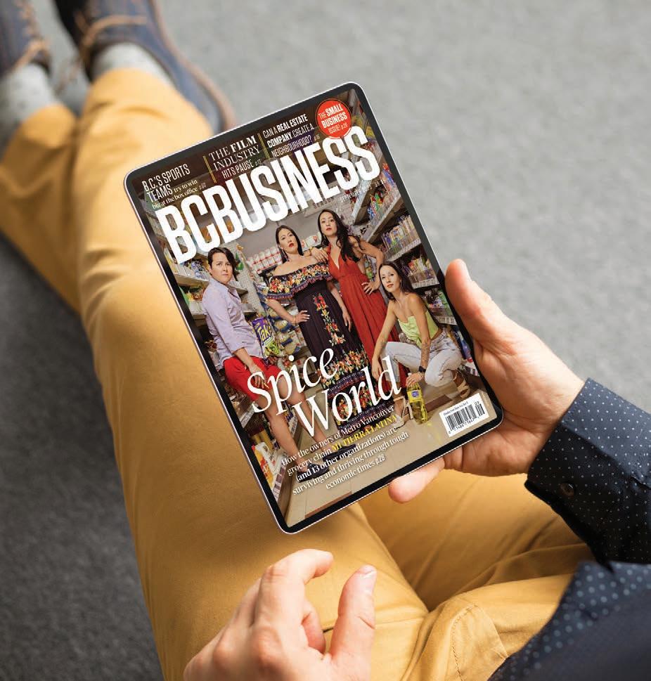 email sales@canadawide.com VANCOUVER MAGAZINE is published seven times a year by Canada Wide Media Limited Suite 130, 4321 Still Creek Drive, Burnaby, B.C. V5C 6S7. Phone 604-299-7311; fax 604-299-9188. Copyright 2023. All rights reserved. No part of this magazine may be reproduced without the publisher’s written permission. Not responsible for unsolicited editorial material. Privacy Policy: On occasion, we make our subscriber list available to carefully screened organizations whose product or service might interest you. If you prefer that we not share your name and address (postal and/or email), you can easily remove your name from our mailing lists by reaching us at any of the listed contact points. You can review our complete Privacy Policy at Vanmag.com. Indexed in the Canadian Magazine Index by Micromedia Ltd. and also in the Canadian Periodical Index. International standard serial no. ISSN 0380-9552. Canadian publications mail product sales agreement #40068973. Printed in Canada by Mitchell Press, 8328 Riverbend Ct, Burnaby, B.C. V3N 5C9. Distributed by Coast to Coast Ltd. BC VANMAG.COM GET A ONE-YEAR SUBSCRIPTION FOR ONE LOW PRICE! (PRINT AND DIGITAL EDITIONS) There’s no easier way to stay smart, informed and ahead of your competition. SUBSCRIBE NOW FOR $14.95/YEAR bcbusiness.ca/special-subscription-offer LIKE US ON