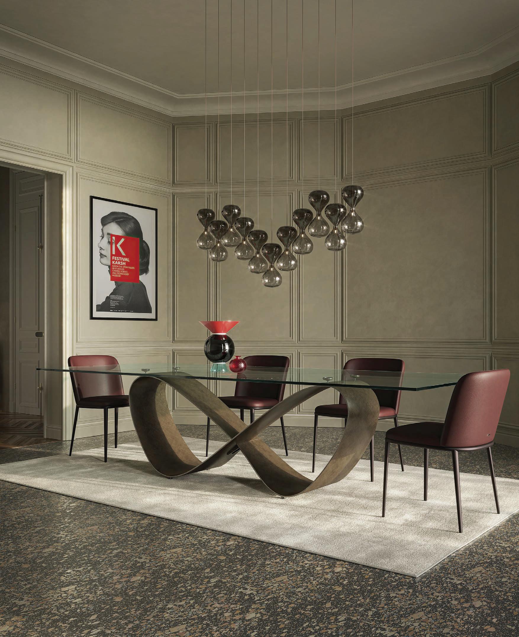 The Butterfly table features a sculptural steel base, adding modern elegance to any dining room. Its sinuous design contrasts beautifully with the delicate glass top, creating a bold yet refined look. Available in different sizes and finishes. See store for details.