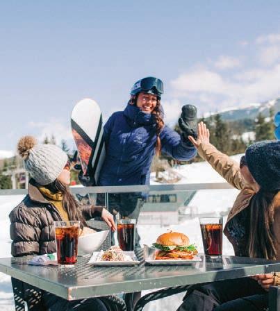 Party central awaits at the foot of the mountain. This is the intersection of athlete and patio, where nightlife begins after lunch and college kids can be found dancing on tables in coordinating theme outfits (in this case, the theme appears to be denim). I’m not particularly in the mood to hop up there with them (is it the poutine or my knees? A lady never tells) so instead I stroll the Village promenade, popping into Ruby Tuesday (26a–4314 Main St., rubytuesdayaccessories .com) to peruse some glittery things—I’ve been flirting with the idea of an anklet for a while—and then Helly Hansen and The North Face (4295 Blackcomb Wy., hellyhansen.com; 32–4314 Main St., thenorthface.com) to