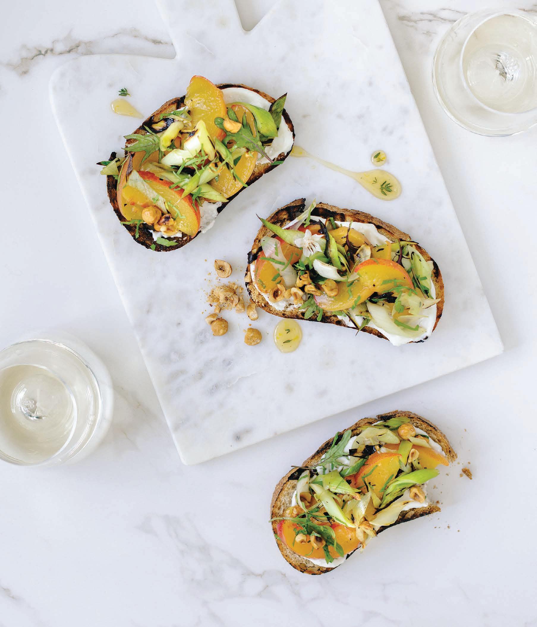At the Modest Butcher, one of the most popular dishes is Things on Toast, an open-faced sandwich that changes as the seasons do, topped with whatever is fresh and delicious right now. This incarnation is prepared with quick-pickled Okanagan peaches, grilled leeks, toasted hazelnuts, whipped goat feta and a thyme-scented white wine gastrique.