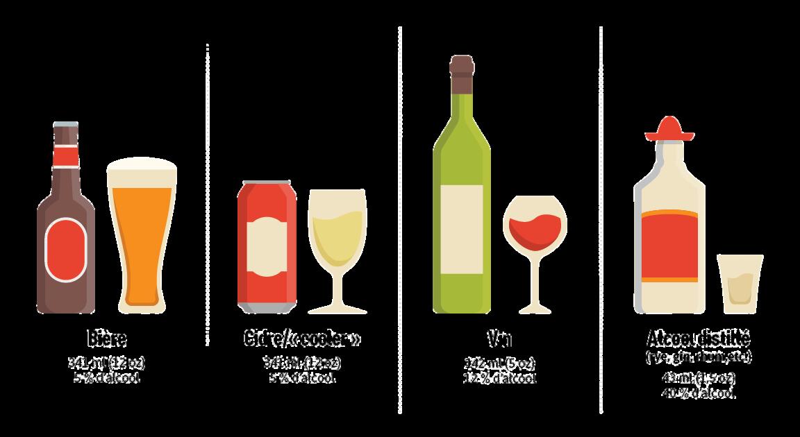 Au Canada, un verre standard correspond à 17,05 millilitres ou 13,45 grammes d’alcool pur C’est l’équivalent de qui suit :