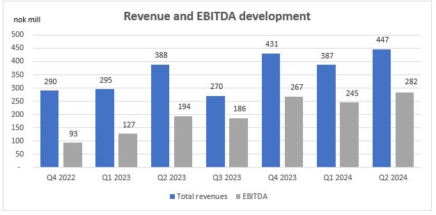 In Q2 Rem Offshore achieved revenues of MNOK 447 and EBITDA of MNOK 282, which corresponds to an EBITDA-ratio of 63%. This is a strong ratio and among the best within all OSV operators.