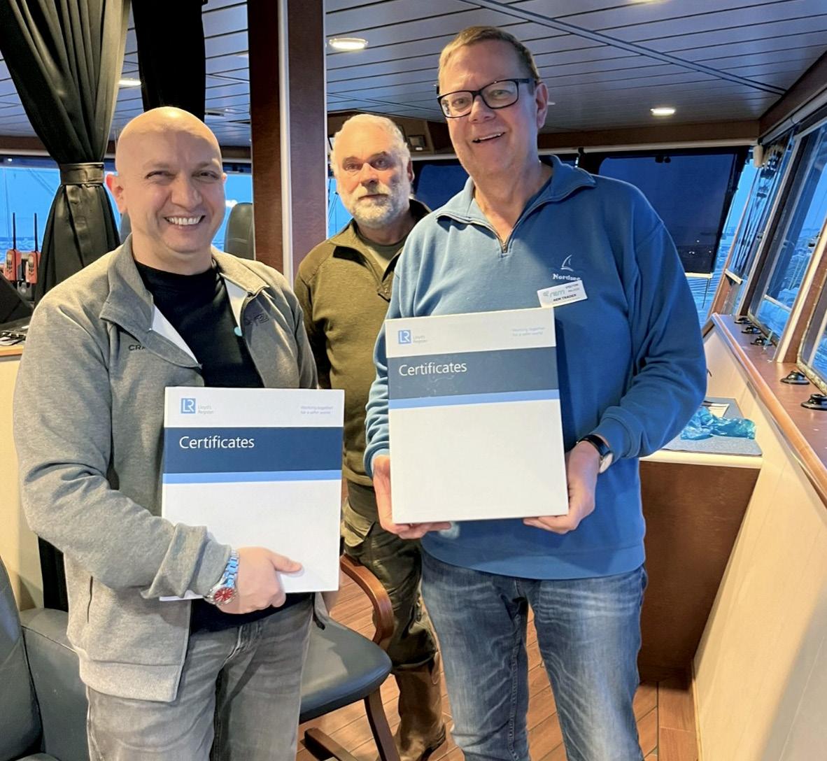 Photo of Capt. Panayot Sivov and the two LR Surveyors onboard Rem Trader.