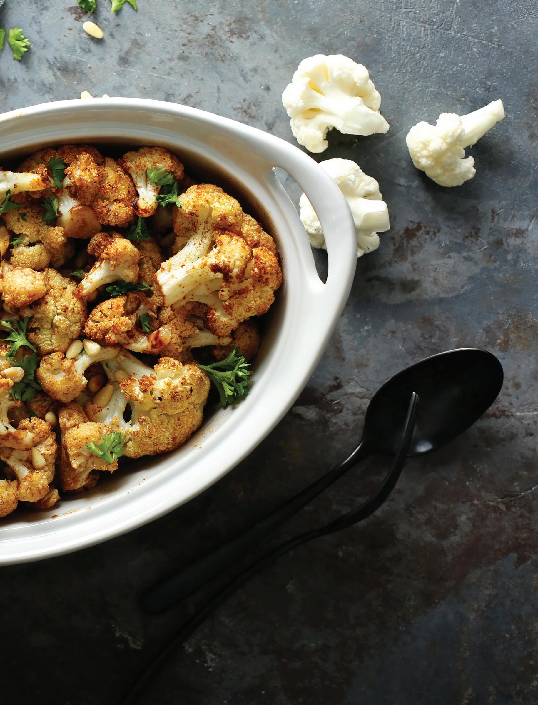 7. Once the cauliflower is done, transfer it to a serving plate and drizzle with the tahini sauce.