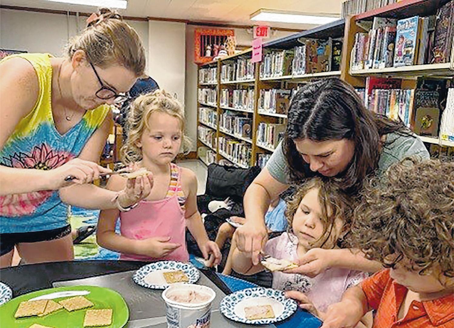 Attendees listened to “Stories of the Bayou: A Trip to Louisiana,” while acting out scenes, such as 14 arm circles for the average length of an alligator or flying like a pelican On her second visit to the library, Langley introduced the children to MyPlate and the five food groups. The children listened to “The Adventures of MyPlate Nutrition Hero,” a story celebrat-