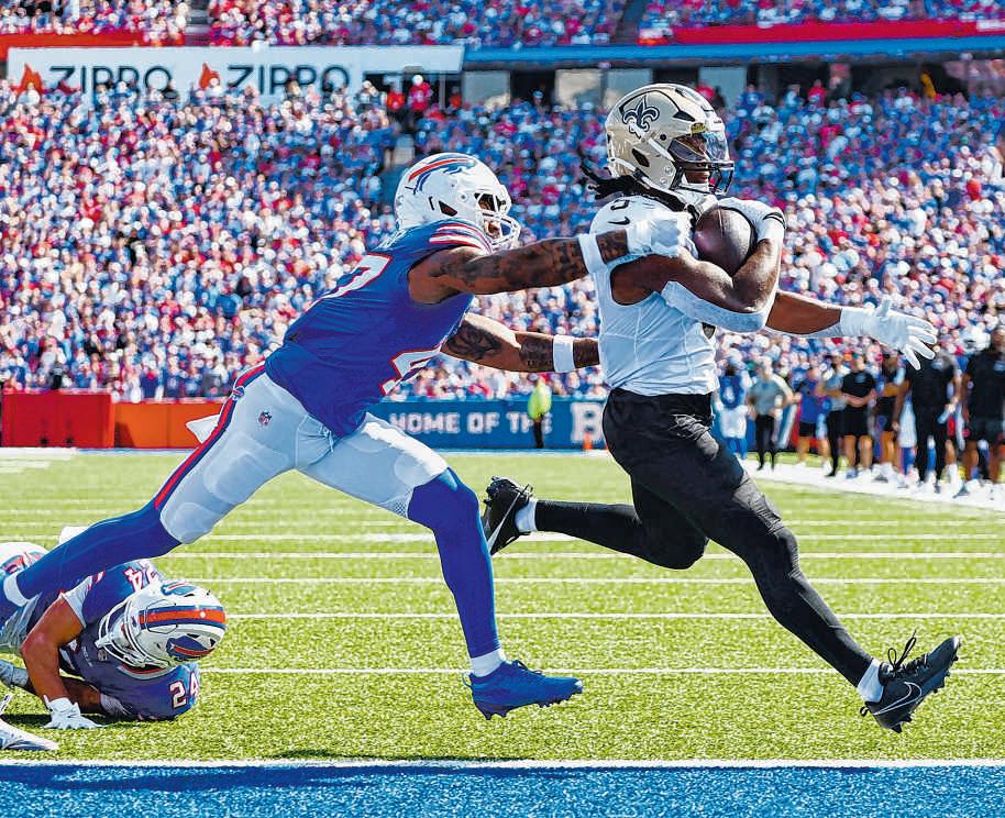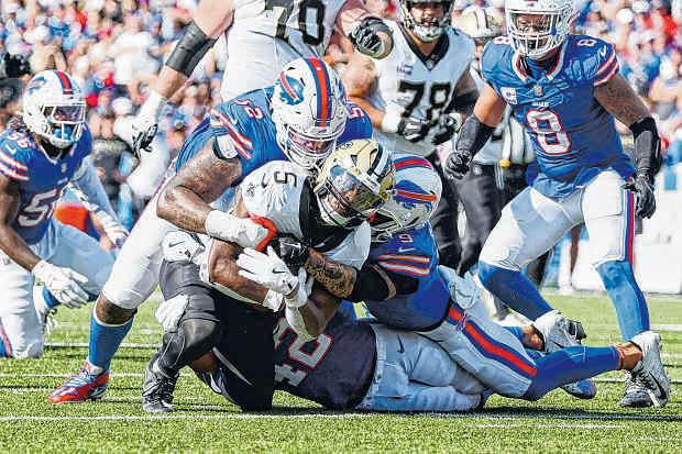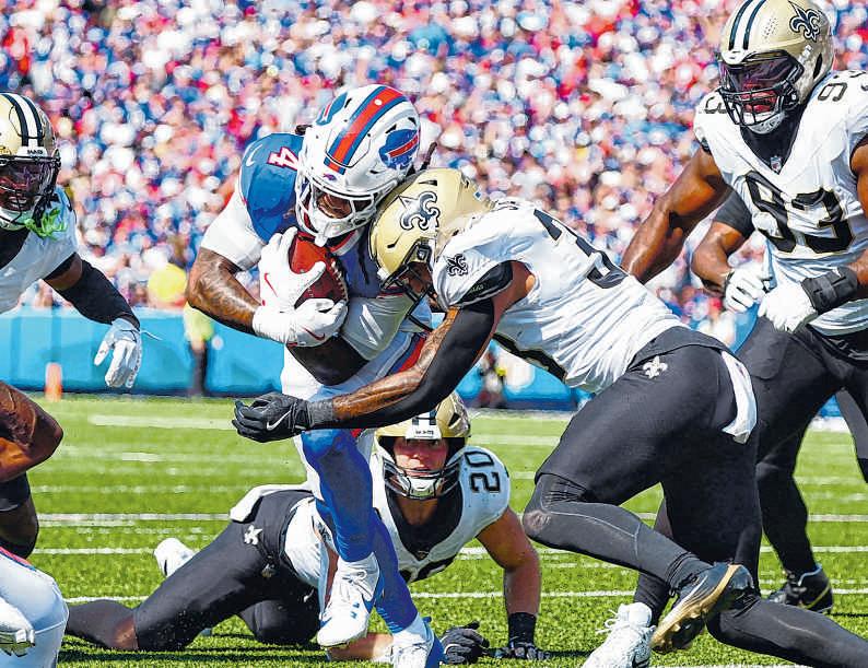 ASSOCIATED PRESS PHOTO BY JEFFREY T. BARNES Saints running back KendreMiller is tackledbyBills linebackerDorian Williams and safety Taylor Rappduring Sunday’sgame. Faced with their most difficult challengeyet,the Super Bowl favorites on the road, the Saints fought hard but ultimately fell 31-19 to theBills on Sunday in Orchard Park, N.Y.The Saints improvedgreatly from an embarrassing performance in Seattle last week and evenappeared for amoment to takethe lead in the fourth quarter, but areplay reviewand some highlightplays from reigning NFL MVP Josh Allenallowed Buffalo to putthe game away.The Saints are 0-4 and returnhometoface the NewYork Giants and NewEngland Patriots in the next twoweeks.
