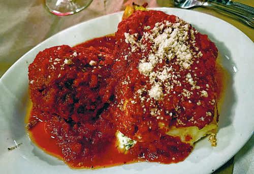 less and instead filledwith ricotta, Parmesan, Romano, provolone and mozzarella cheese. It’sserved with one meatballthat’s bigenough to cut into at least four pieces.