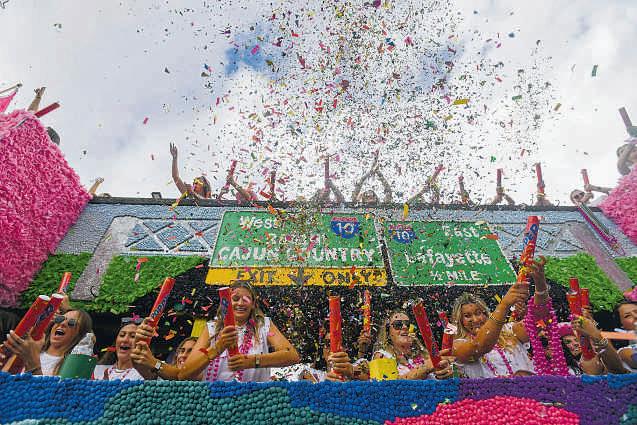Confetti flies from the Phi Mu Sorority float during the University of Louisiana at Lafayette Homecoming Parade at Our Lady of Lourdes Stadium in Lafayette on Saturday.