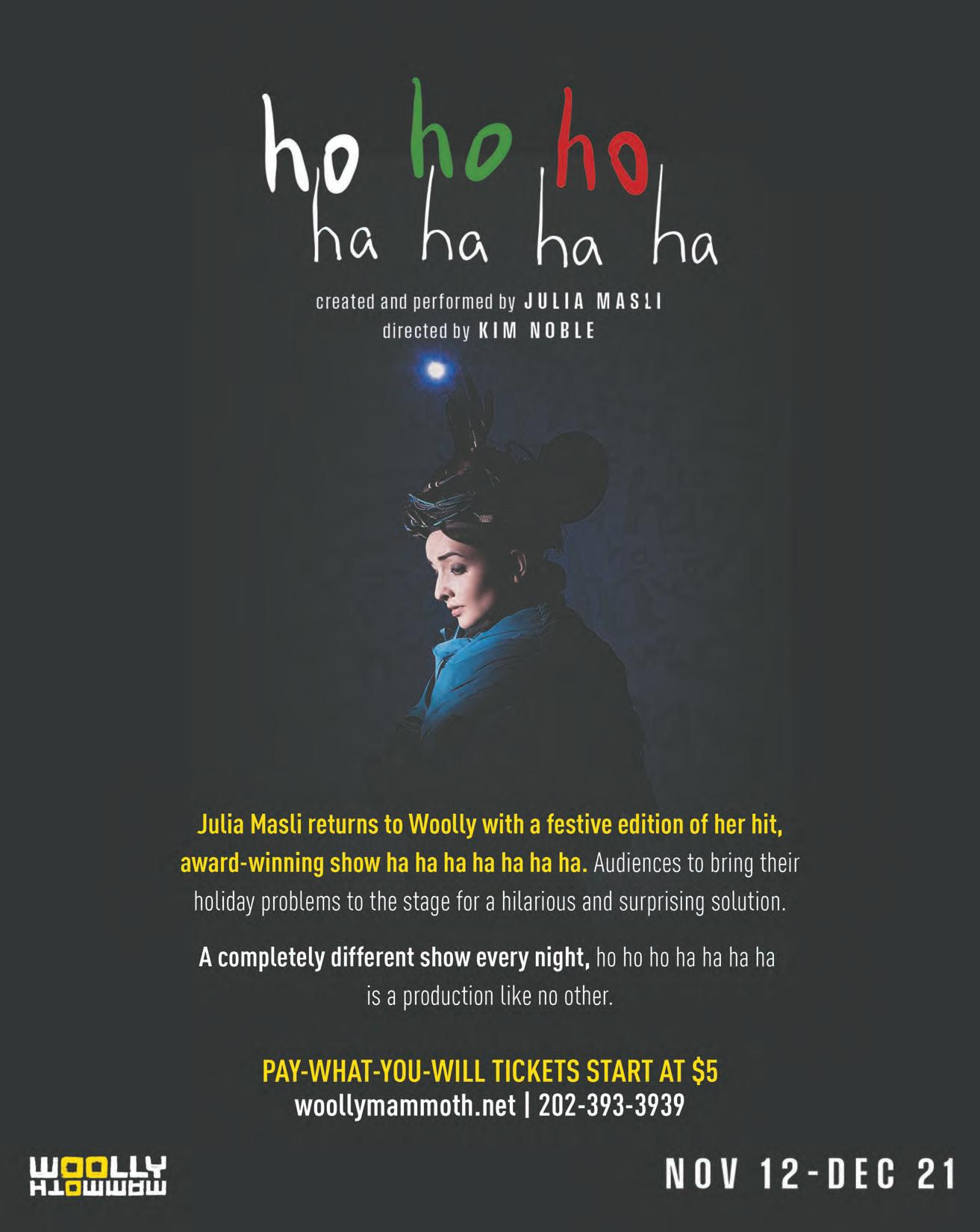 This holiday season, Julia Masli returns to Woolly with a festive edition of her hit, award-winning show “ha ha ha ha ha ha ha,” now titled “ho ho ho ha ha ha ha.” Fresh off a global tour, Masli invites audiences to bring their holiday problems to the stage for a hilarious and surprising solution. A completely different show every night at Woolly Mammoth, 641 D St. NW, from Nov. 13 to Dec. 21. While no two shows are the same, the show is friendly for all ages. Tickets start at $49. woollymammoth.net.