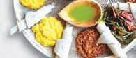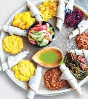 Traditionally Ethiopians eat communally. Stews and other dishes are arranged on a bed of injera, a soft, spongy flatbread that is made with fermented teff flour. Diners break off pieces of injera to scoop up food.