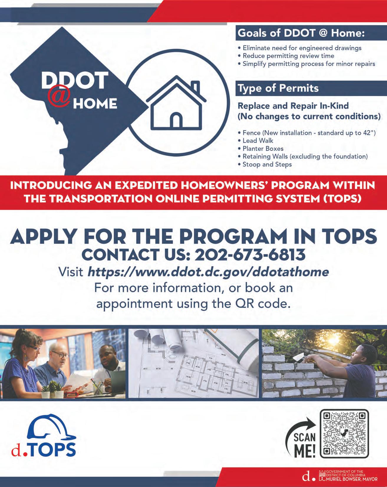 gram designed to simplify the public space construction permit application process for residential property owners. Accessible through DDOT’s Transportation Online Permitting System (TOPS), the program o ers a faster, easier path for homeowners making minor improvements. e program, formally titled d.@home, focuses on small-scale residential projects that require access to public space. By omitting the need for engineering drawings and reducing application review time, DDOT at Home simpli es the permit process for all District residents. For more information, visit ddot.dc.gov/ddotathome or contact DDOT’s Public Space Regulation Division at 202-673-6813.