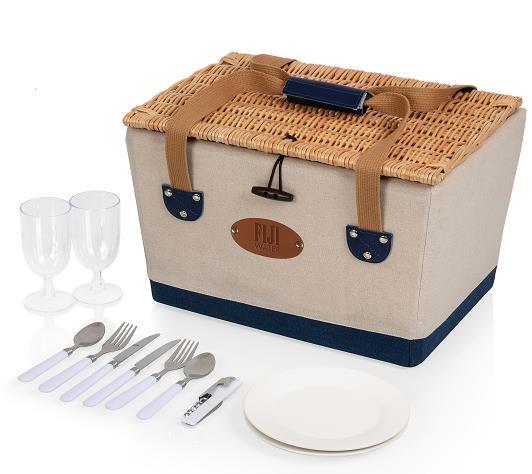 Boardwalk Picnic Basket Durable canvas over wooden frame with fullylined interior and woven wicker lid | Includes 2 porcelain plates, 2 sets of stainless steel flatware, 2 shatter-resistant wine glasses, and a stainless waiter's corkscrew | Lid locking mechanism and carry straps | Measures 16“ x 12“ x 10.25“ Custom patch on the front 50-100: $82.00 ea Setup: $80.00 Production time: 10-12 business days