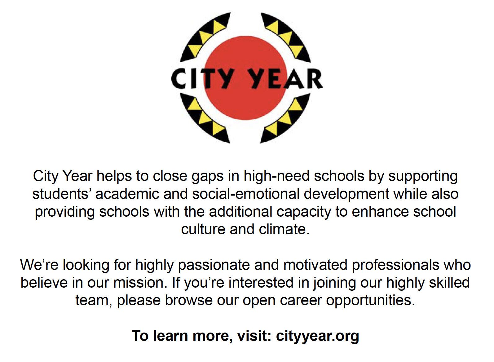 Looking for: All Majors | B* | Available for: Full-time Job, Community Service, Service-Learning City Year, an AmeriCorps program, helps students across schools succeed. Diverse teams of City Year AmeriCorps members provide support to students, classrooms and the whole school, helping to ensure that students in systematically under-resourced schools receive a highquality education that prepares them with the skills and mindset to thrive and contribute to their community.