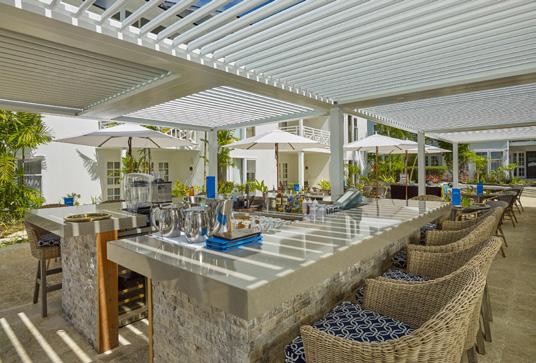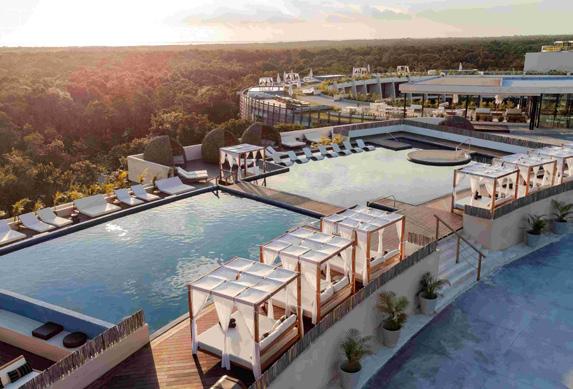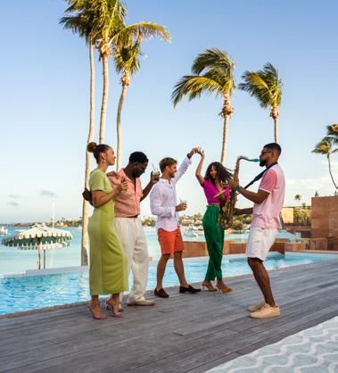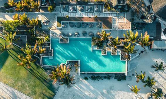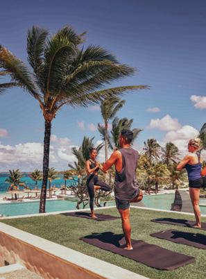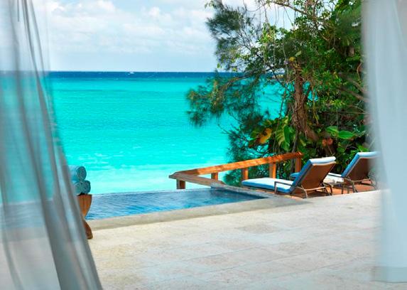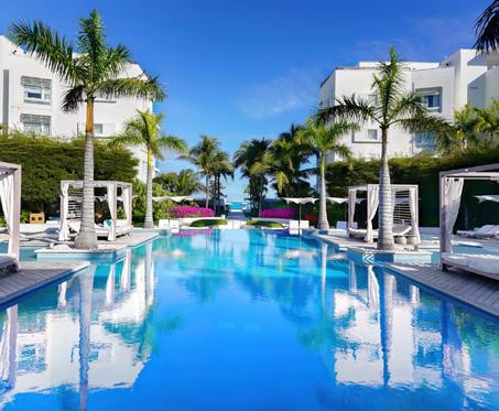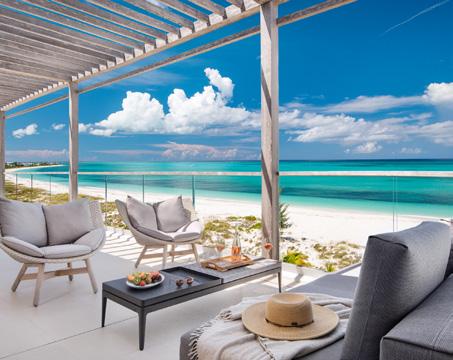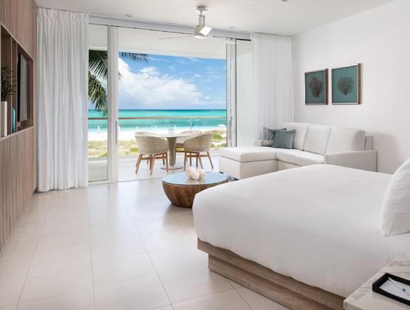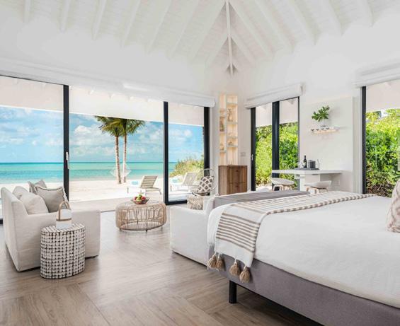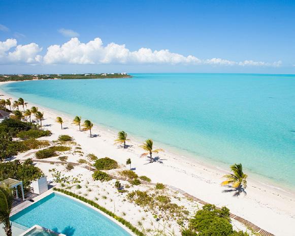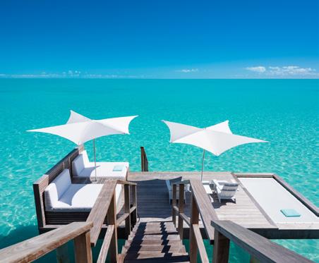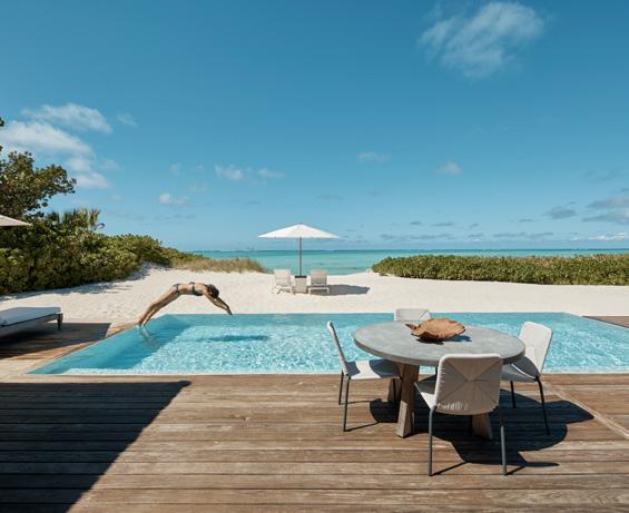 Turks & Caicos chain, that feeling of blissful isolation is dialled up even further. Ambergris Cay is a 1,100acre private island with its own airstrip, a 20-minute flight or twohour boat ride from Providenciales. Just 17 bungalows and nine villas are scattered across the island, each with a private pool, and you’ll be provided with a golf buggy to explore at your own pace. This is a true luxury all-inclusive, and the ever-changing menus at the two exquisite beachfront restaurants will surprise and delight you. Bliss out at the Elevate Spa, enjoy guided nature walks and keep in shape at the fitness pavilion, equipped with Peloton bikes and a yoga deck. One of the highlights of the hotel is the Floating Hangover Bar experience at Little Ambergris Cay, which is offered to guests three times a week on complimentary basis.